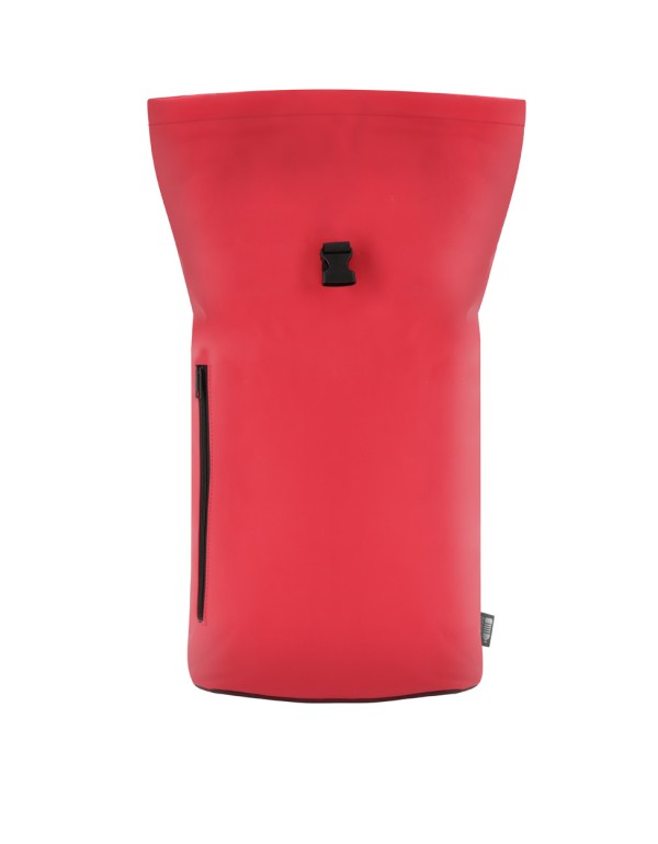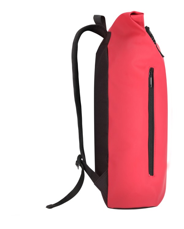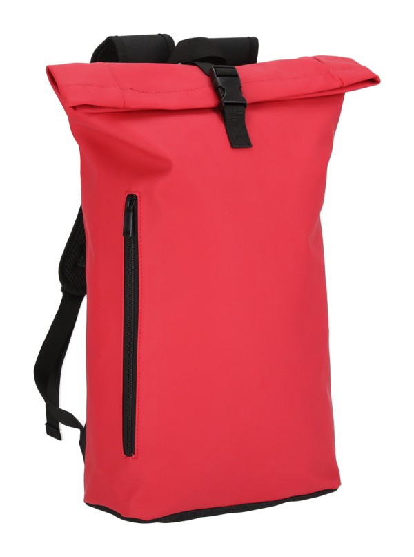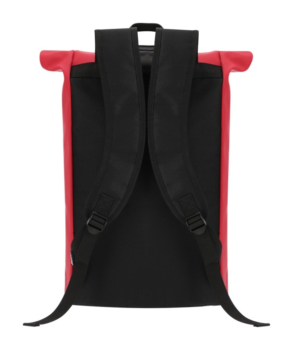Rucsac rolltop din piele PU moale, reciclată, impermeabil, cu închidere cu cataramă, buzunar frontal cu fermoar și compartiment căptușit pentru laptop (15"). Cu spate și bretele căptușite. Cu etichetă distinctivă din PU reciclată.