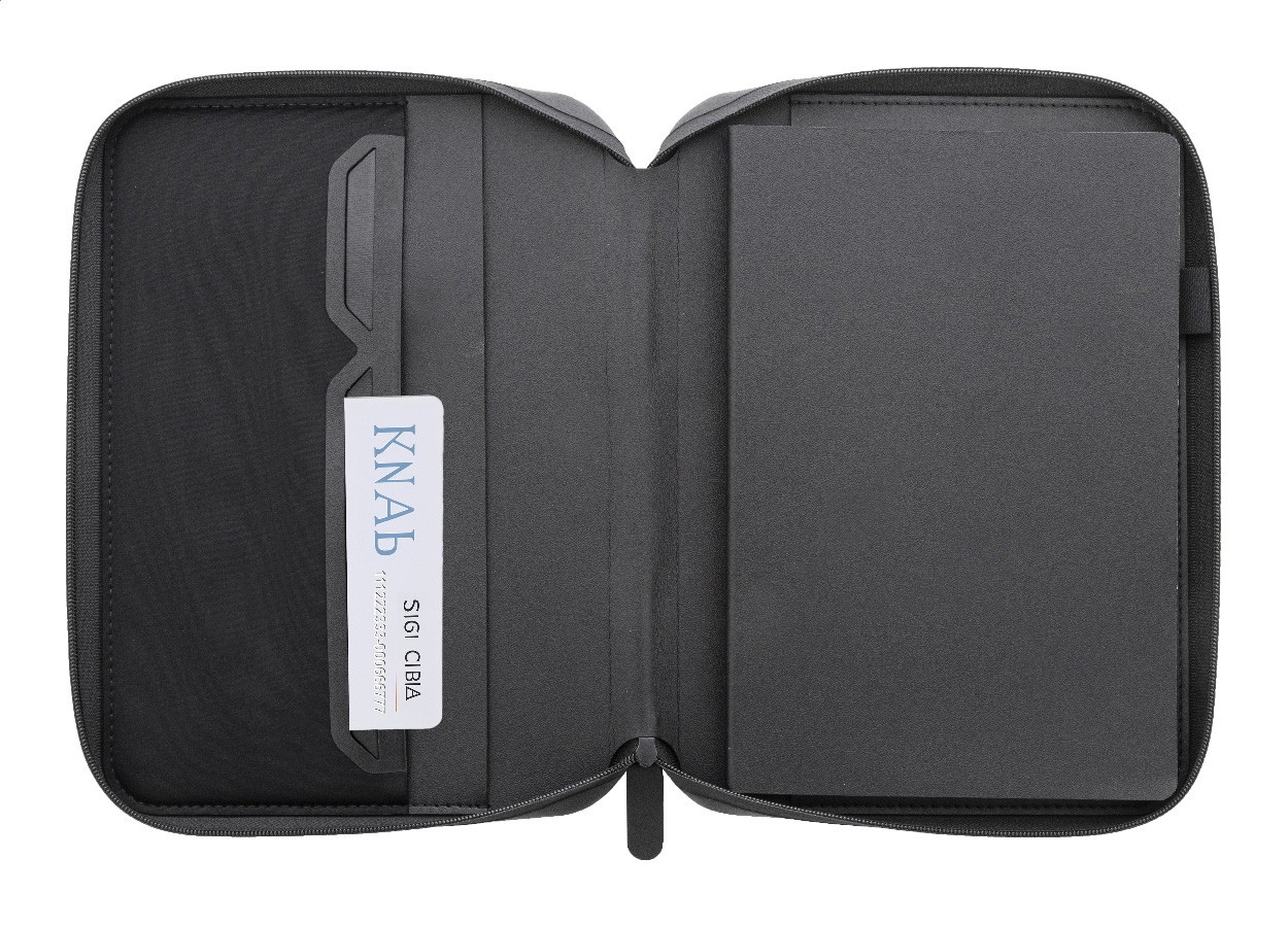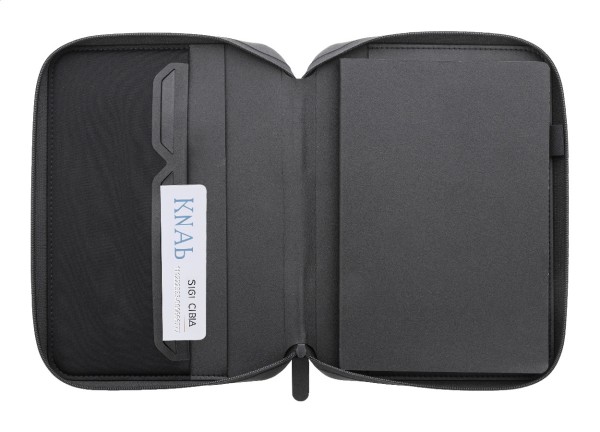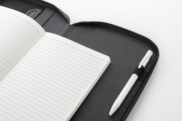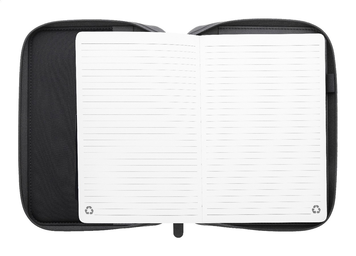 Mapă documente, de lux, cu fermoar pentru documente, din piele PU reciclată, cu blocnotes cu 64 de foi dictando din hârtie reciclată. Prezintă mai multe buzunare interioare pentru cărți de vizită și documente. Dimensiune A5.