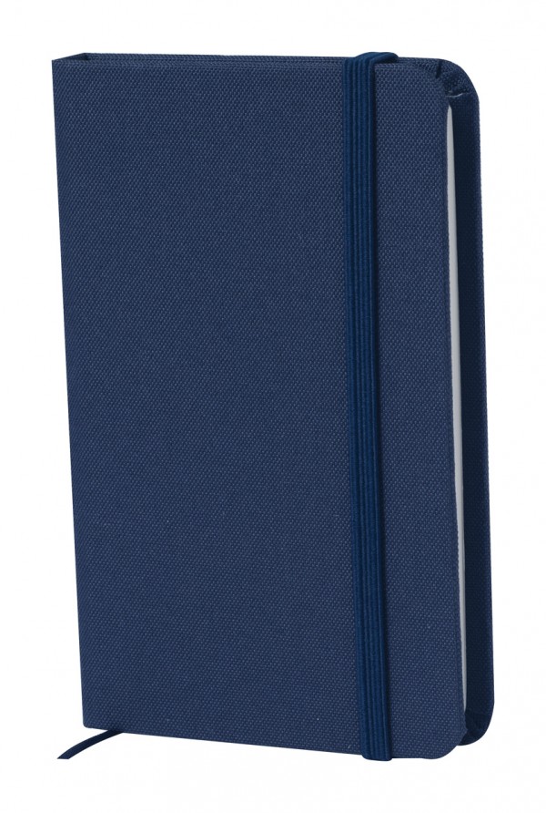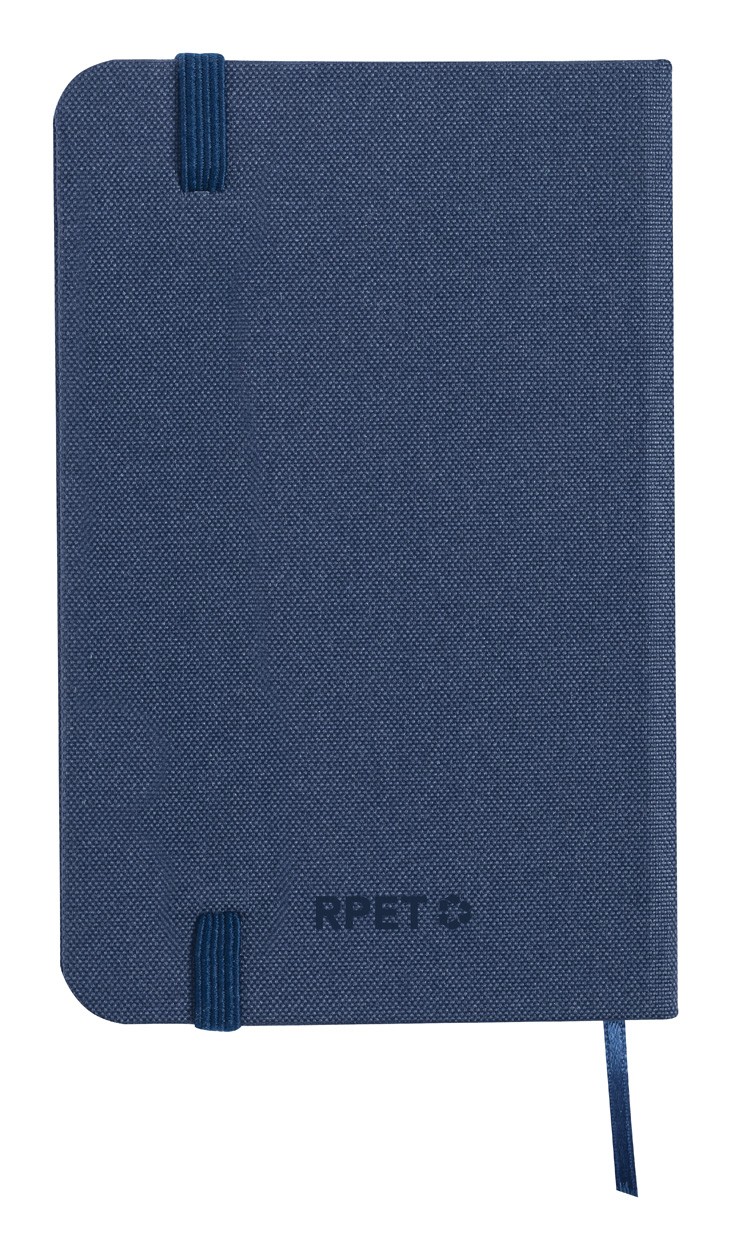 300D RPET polyester covered notebook with 100 lined sheets, bookmark and rubber strap.