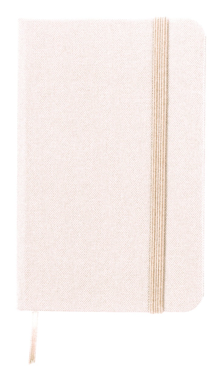 300D RPET polyester covered notebook with 100 lined sheets, bookmark and rubber strap.