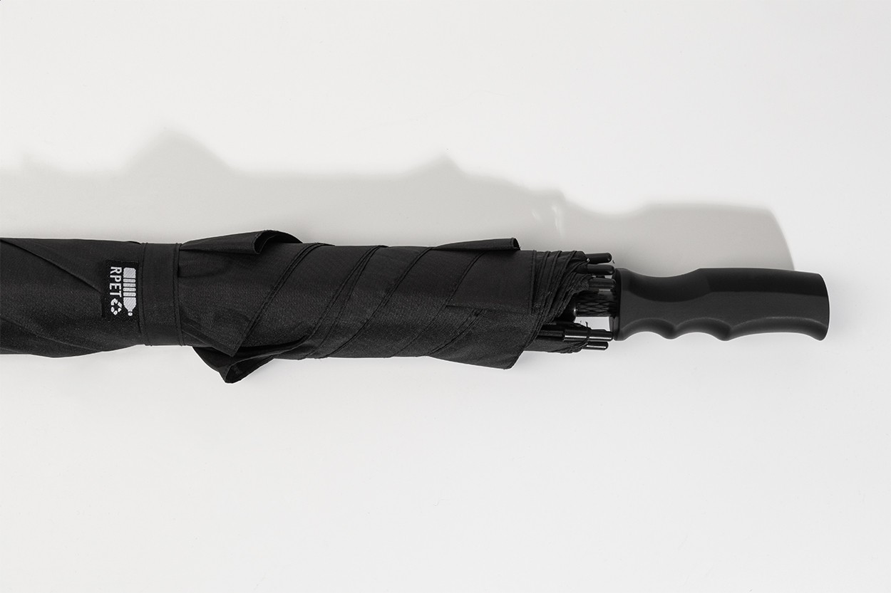 Umbrelă pătrată automată, rezistentă la vânt, de dimensiuni mari, cu ax și cadru din fibră de sticlă, mâner din ABS cauciucat. Pongee 190T RPET. Cu etichetă RPET distinctivă.