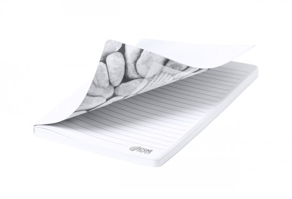 Caiet din hârtie de piatră cu 60 de coli liniate, dimensiunea A5. Hârtia de piatră este 100% reciclabilă, fără clor și impermeabilă.