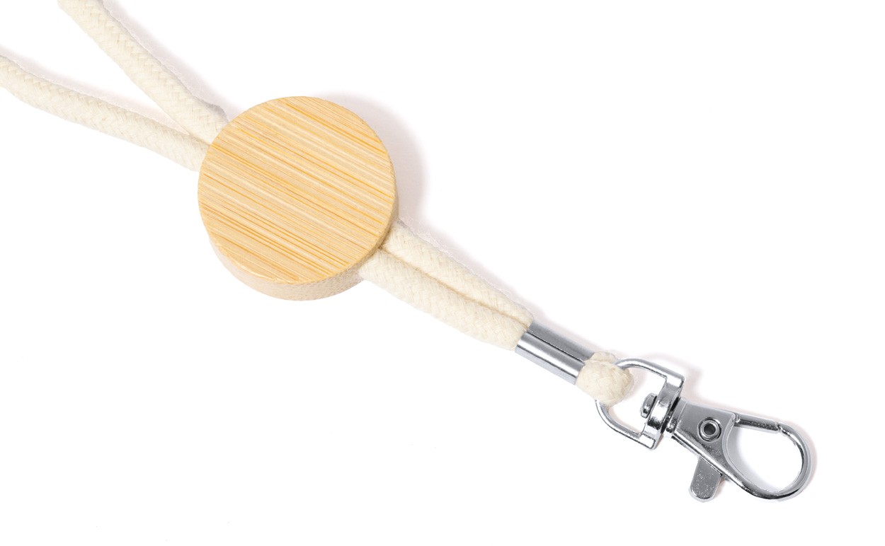 Snur din bumbac, cu carabină metalică, cataramă de siguranță și etichetă rotundă din bambus.