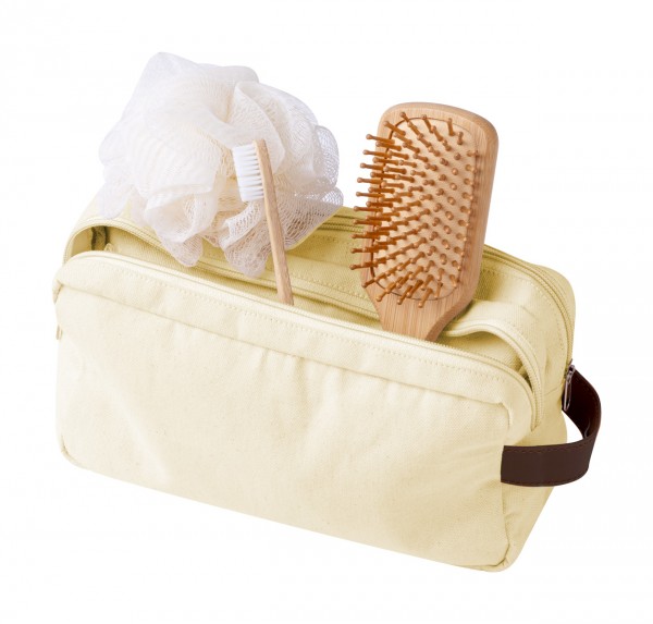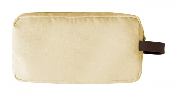 Zipped canvas cosmetic bag with 2 compartments and brown PU leather handle.
