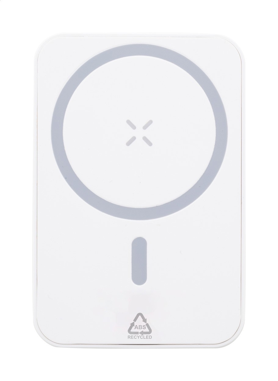 Baterie externă, din ABS reciclat, cu baterie de 5000 mAh și încărcător wireless magnetic încorporat (5W). Cu intrare USB-C și port pentru încărcător. Include inel metalic autoadeziv pentru a utiliza funcția magnetică pe orice dispozitiv de încărcare fără fir. Compatibil cu iPhone® 12 sau mai nou. Inclusiv cablu de încărcare USB.