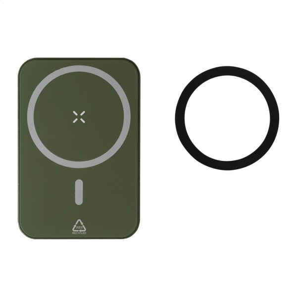 Baterie externă, din ABS reciclat, cu baterie de 5000 mAh și încărcător wireless magnetic încorporat (5W). Cu intrare USB-C și port pentru încărcător. Include inel metalic autoadeziv pentru a utiliza funcția magnetică pe orice dispozitiv de încărcare fără fir. Compatibil cu iPhone® 12 sau mai nou. Inclusiv cablu de încărcare USB.
