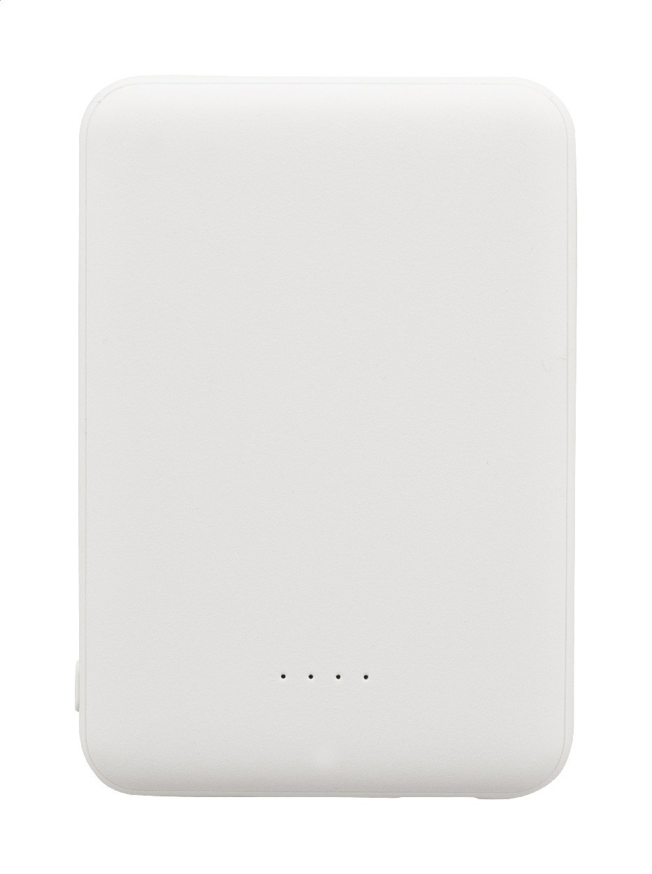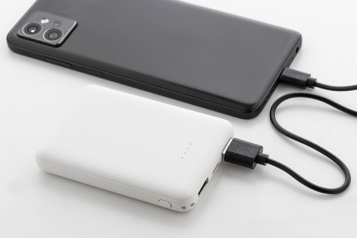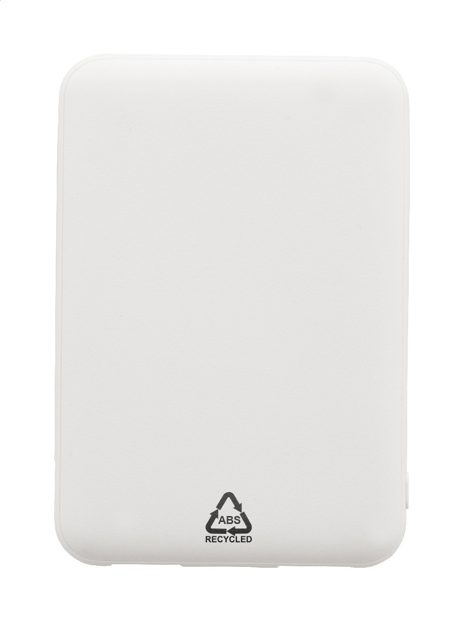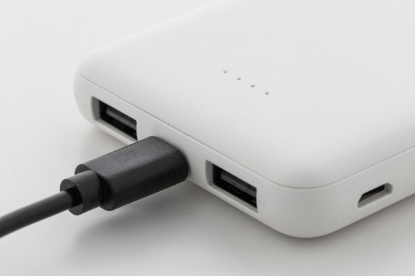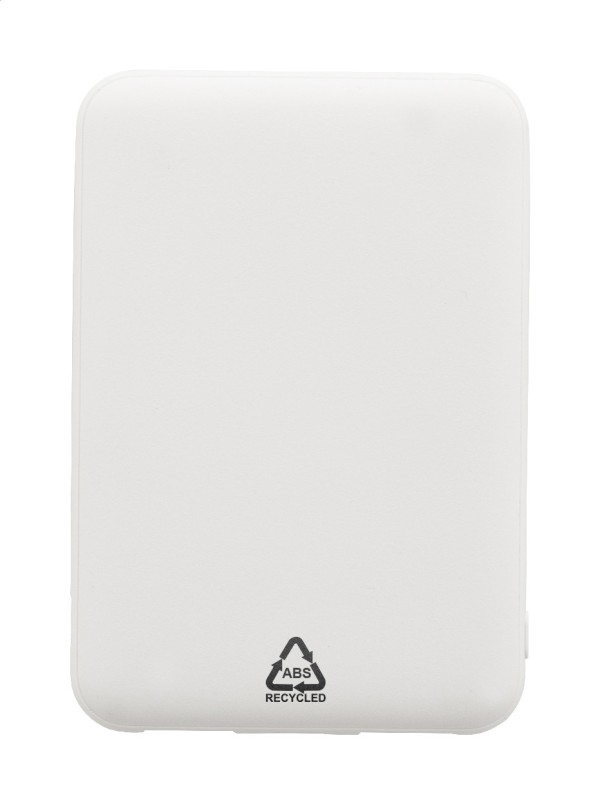 Baterie externă, din ABS reciclat, cu baterie de 5000 mAh. Cu 2 porturi USB și 1 porturi de încărcare USB-C. Porturi de intrare Micro USB și USB-C. Include cablu de încărcare USB.