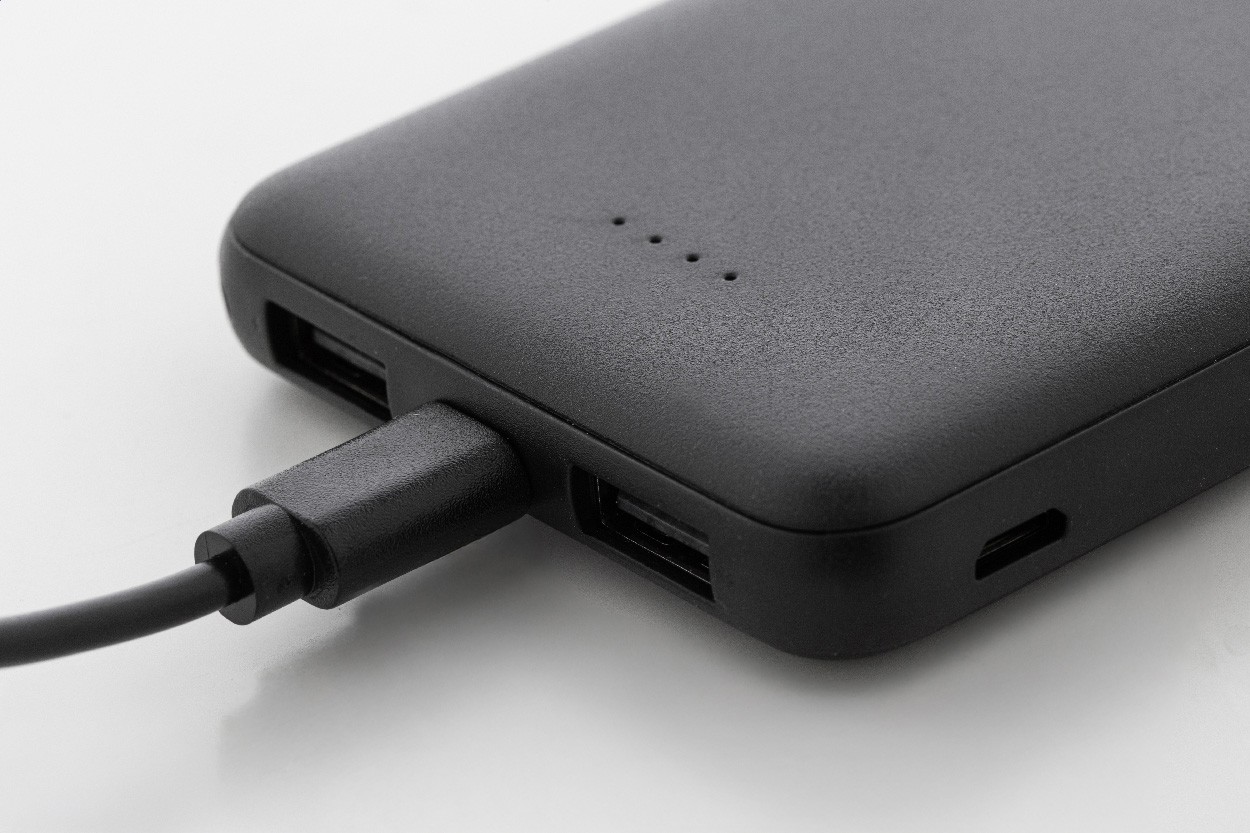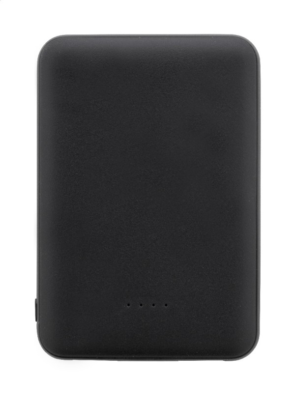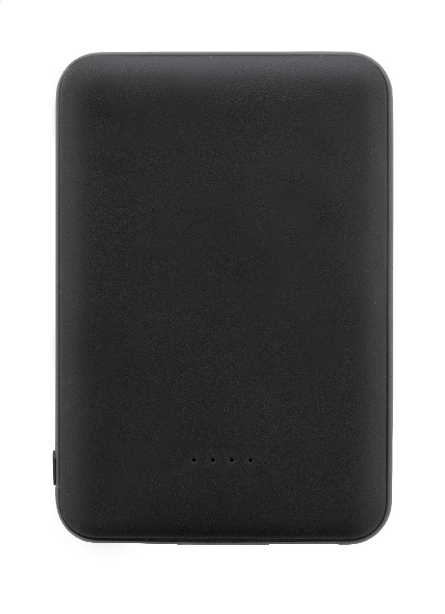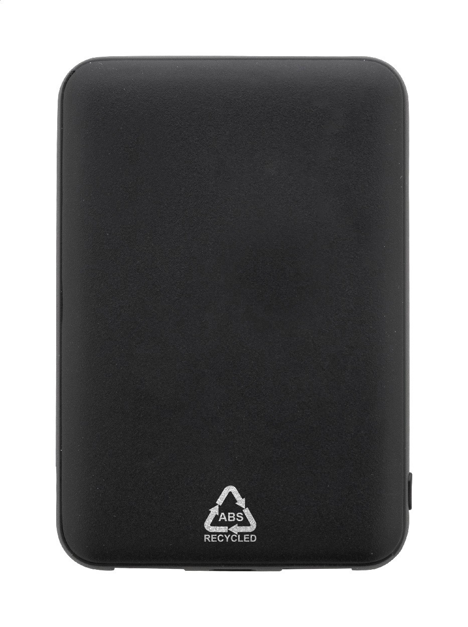 Baterie externă, din ABS reciclat, cu baterie de 5000 mAh. Cu 2 porturi USB și 1 porturi de încărcare USB-C. Porturi de intrare Micro USB și USB-C. Include cablu de încărcare USB.