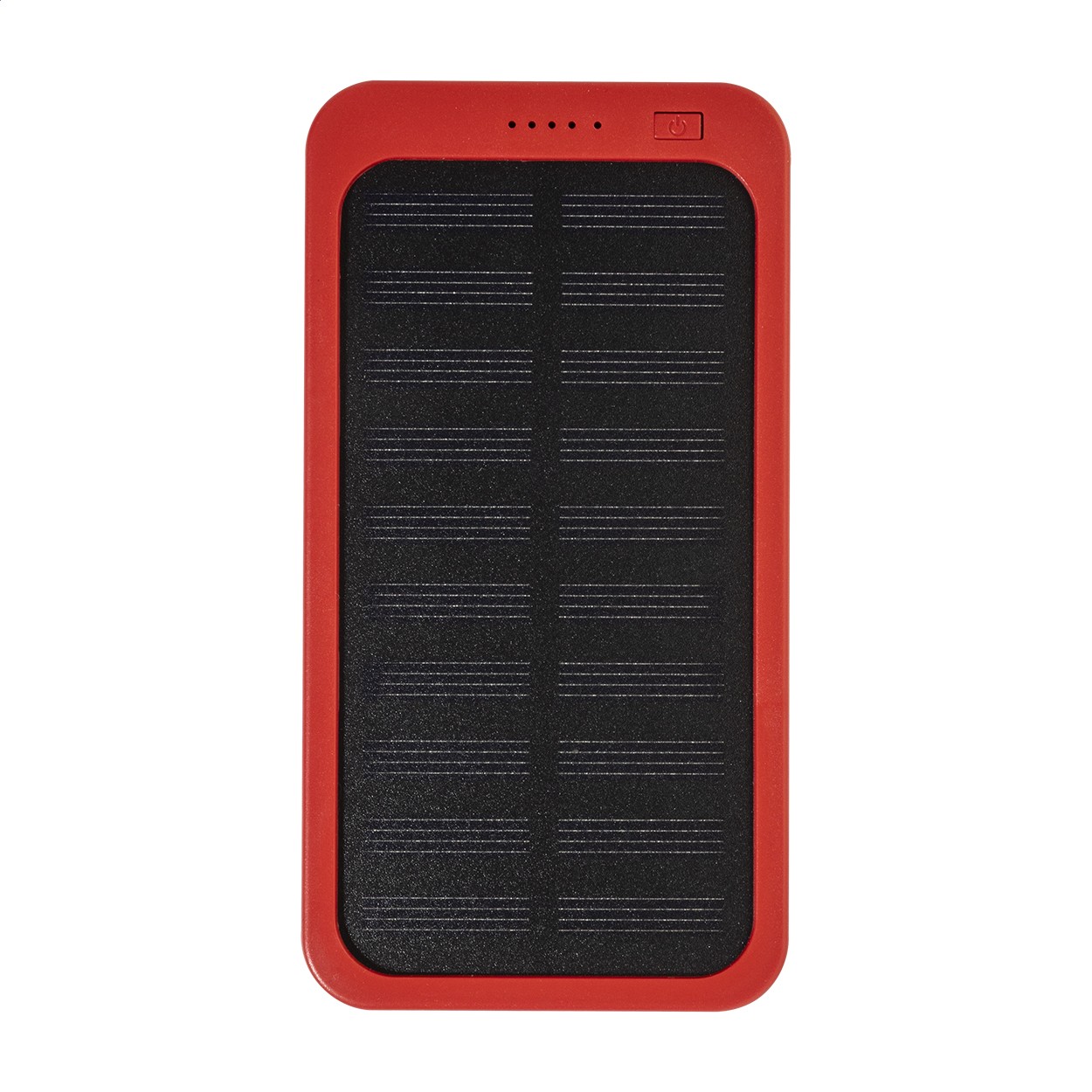 Baterie externă, din ABS reciclat, cu încărcător solar încorporat și baterie de 4000 mAh. Cu 1 port USB și 1 port USB-C pentru încărcare. Port de intrare USB-C. Include cablu de încărcare USB.