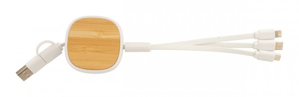 Cablu de încărcare USB telescopic din ABS reciclat și bambus. Cu conectori micro USB, USB-C și Lightning. Cu intrări USB și USB-C.