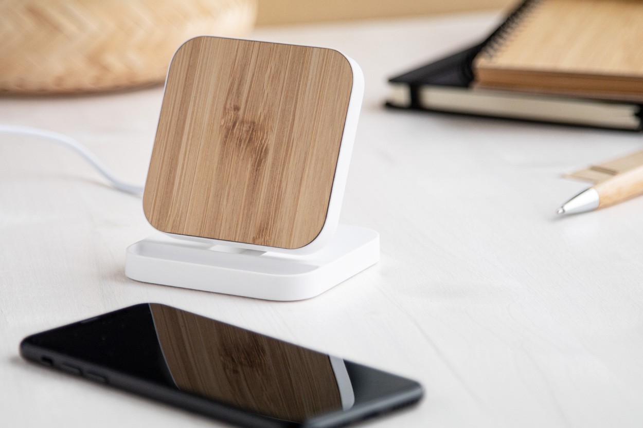 Suport mobil, din ABS reciclat, cu încărcător rapid fără fir încorporat acoperit cu bambus (15W). Inclusiv cablu de încărcare USB.