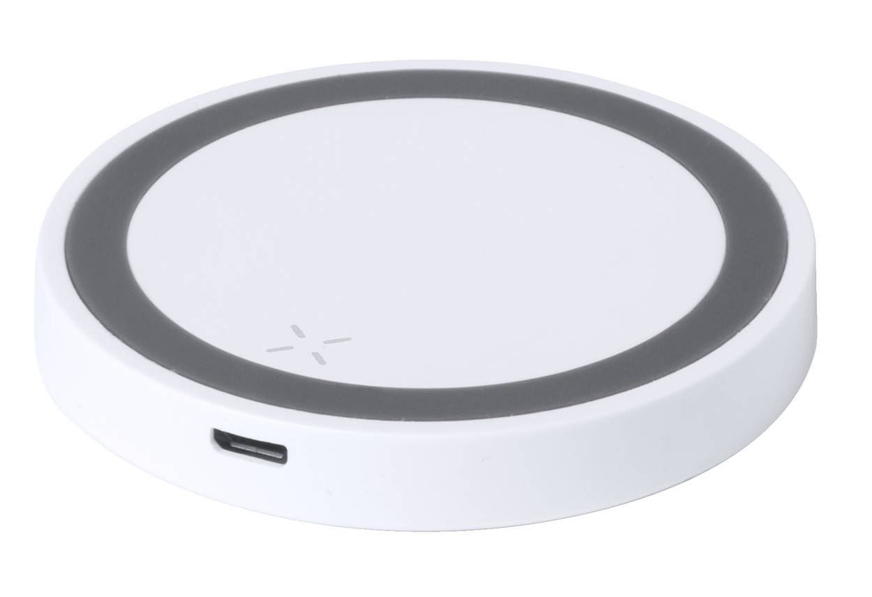 Încărcător wireless în carcasă rotundă din plastic cu bază antiderapantă. Putere max: 1000 mA. Cablu USB inclus.