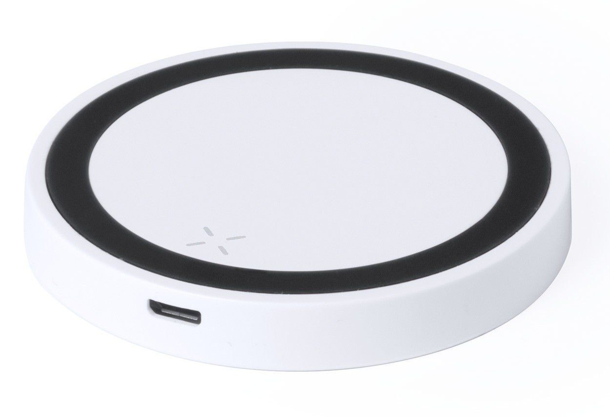 Încărcător wireless în carcasă rotundă din plastic cu bază antiderapantă. Putere max: 1000 mA. Cablu USB inclus.