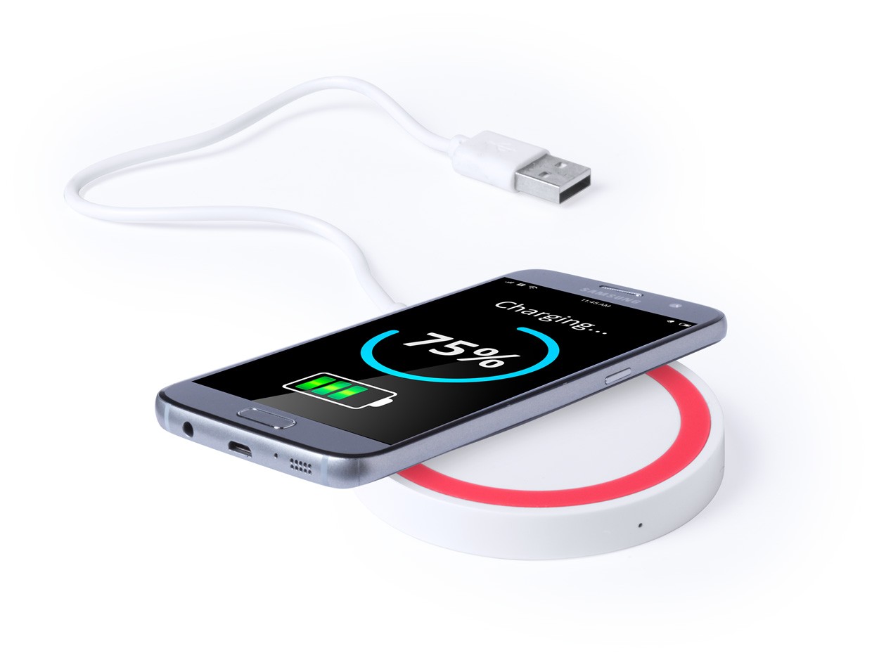 Încărcător wireless în carcasă rotundă din plastic cu bază antiderapantă. Putere max: 1000 mA. Cablu USB inclus.