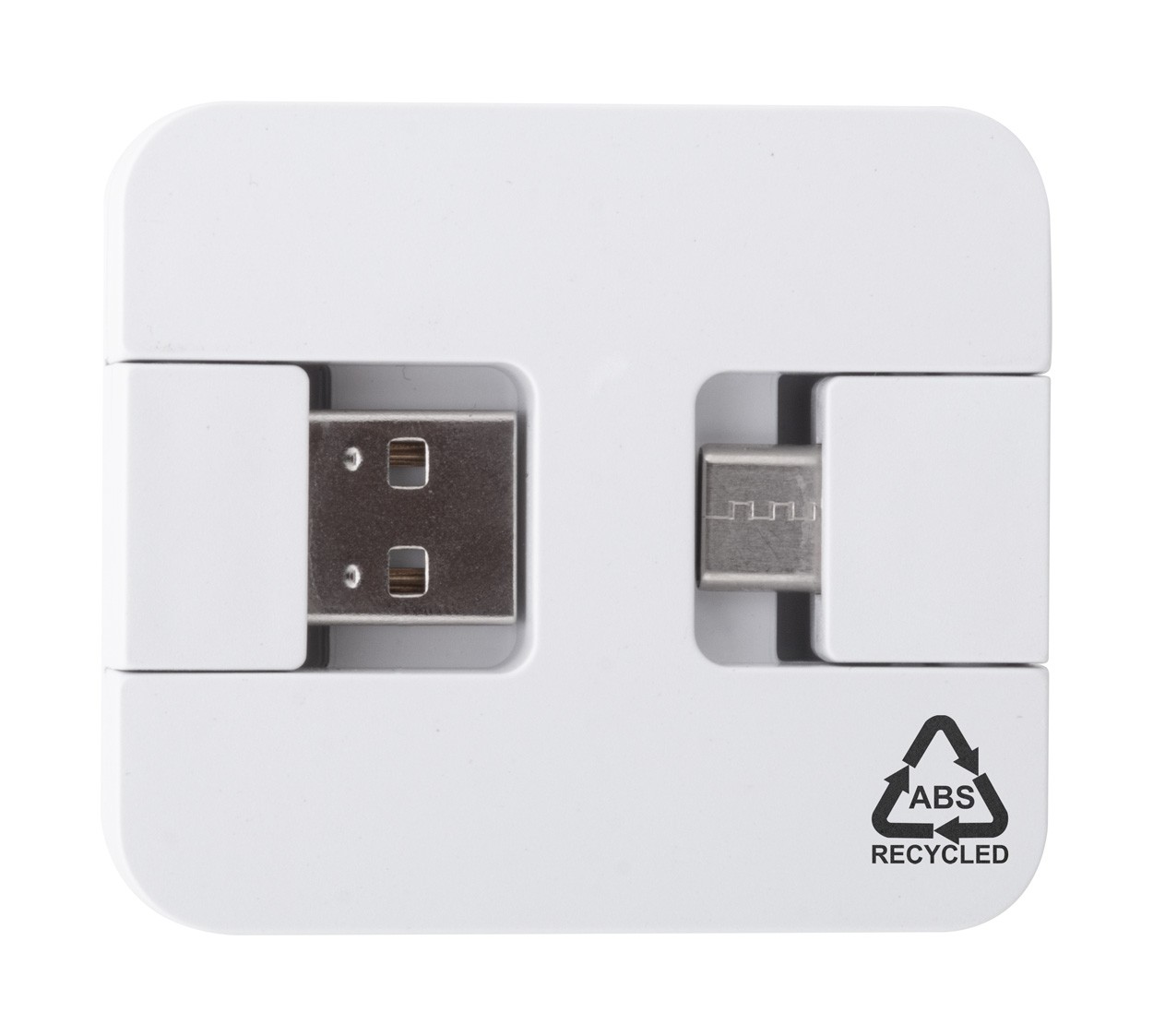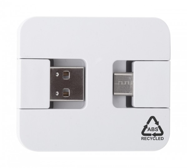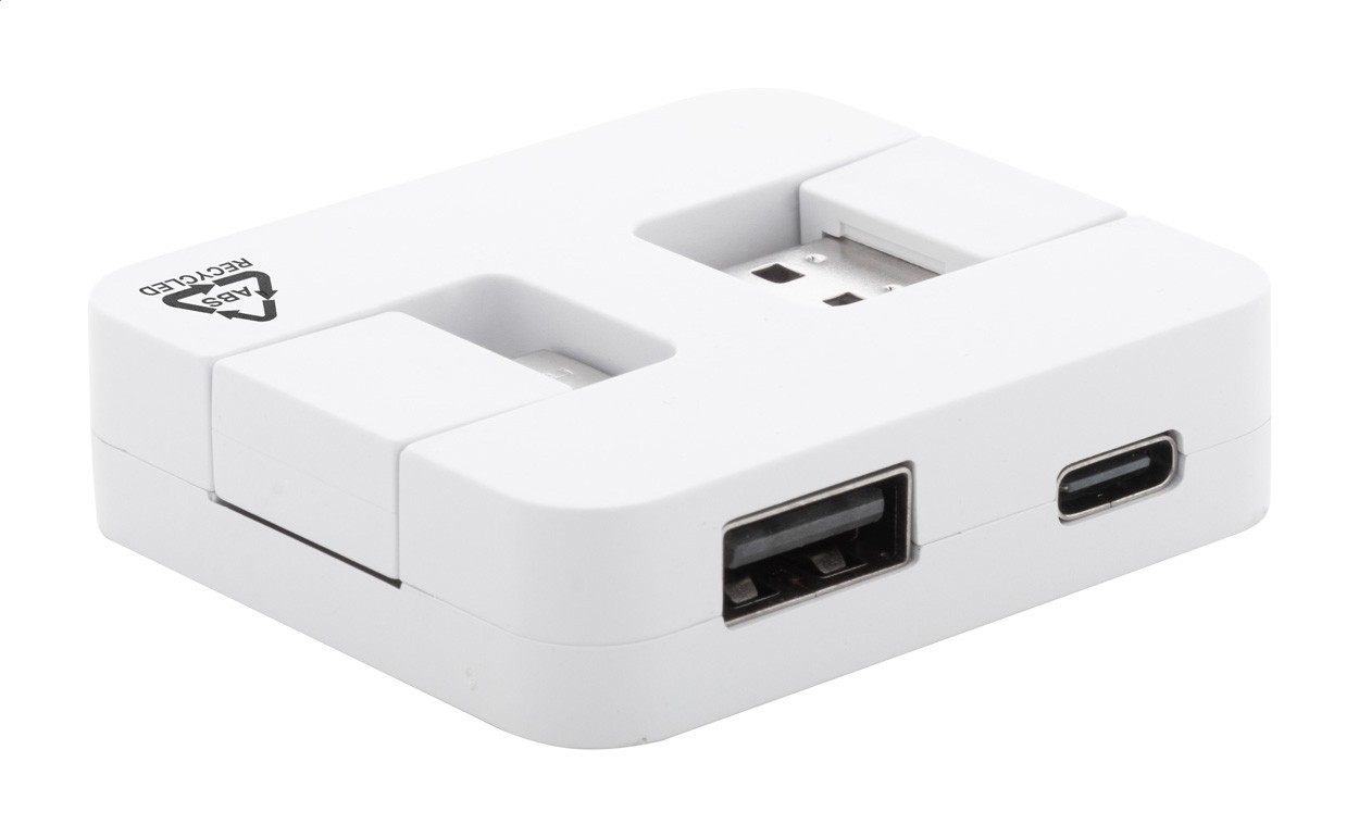 Hub USB, din plastic ABS reciclat, cu 2 porturi USB și 2 porturi USB-C. Cu conectori USB și USB-C pliabil. USB 2.0.