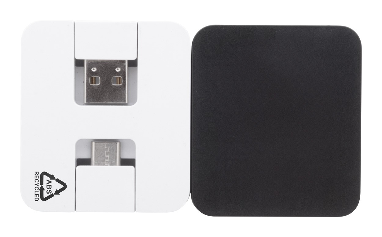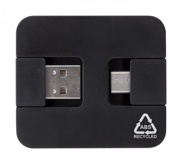 Hub USB, din plastic ABS reciclat, cu 2 porturi USB și 2 porturi USB-C. Cu conectori USB și USB-C pliabil. USB 2.0.