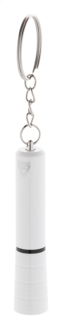 Mini lanternă din plastic ABS reciclat, cu 1 LED, finisaj metalic și breloc metalic. Cu baterie tip buton.
