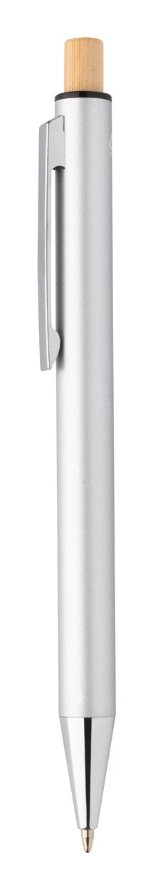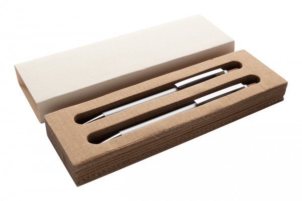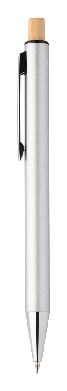 Set din aluminiu reciclat cu pix și creion mecanic cu buton din bambus. Cu mină albastră și mină creion de 0,7 mm. În cutie de hârtie kraft.