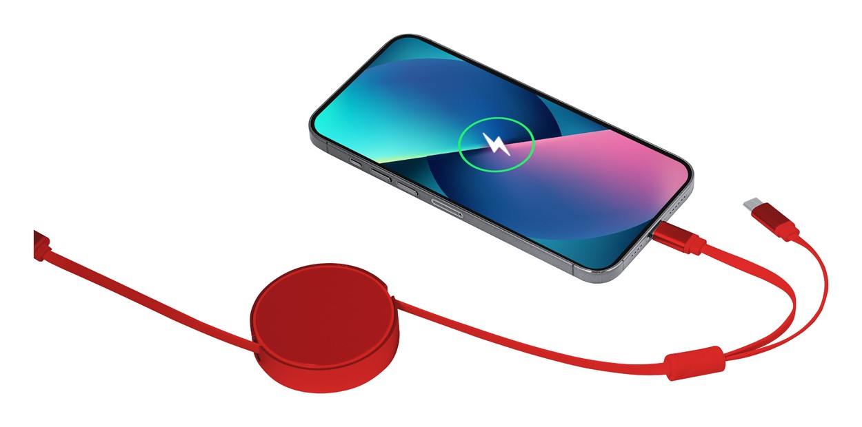 Cablu de încărcare USB telescopic din aluminiu reciclat. Cu conectori micro USB, USB-C și Lightning. Cu intrări USB și USB-C.