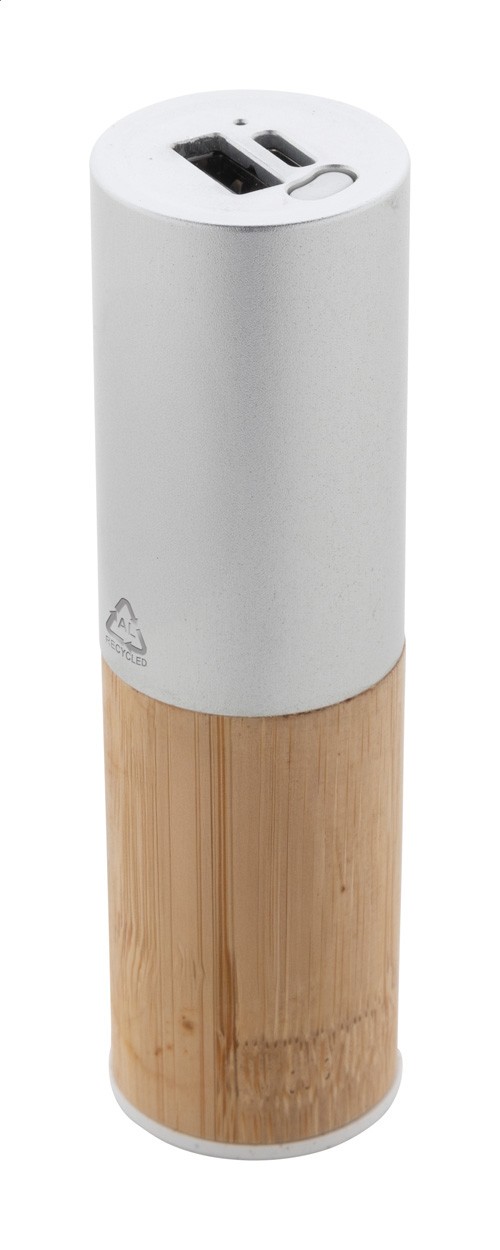 Bateriedin aluminiu reciclat și bambus, cu baterie de 2600 mAh. Cu 1 port USB și 1 port USB-C pentru încărcător. Port de intrare USB-C. Inclusiv cablu de încărcare USB.