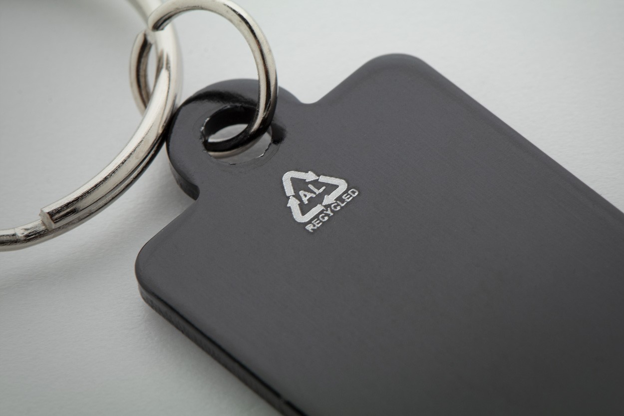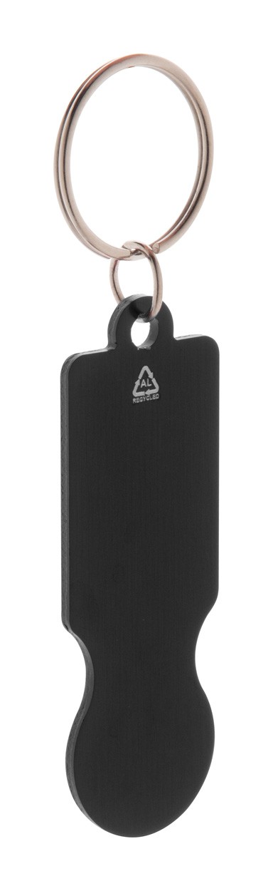 Breloc din aluminiu reciclat, cu monedă cărucior de cumpărături.