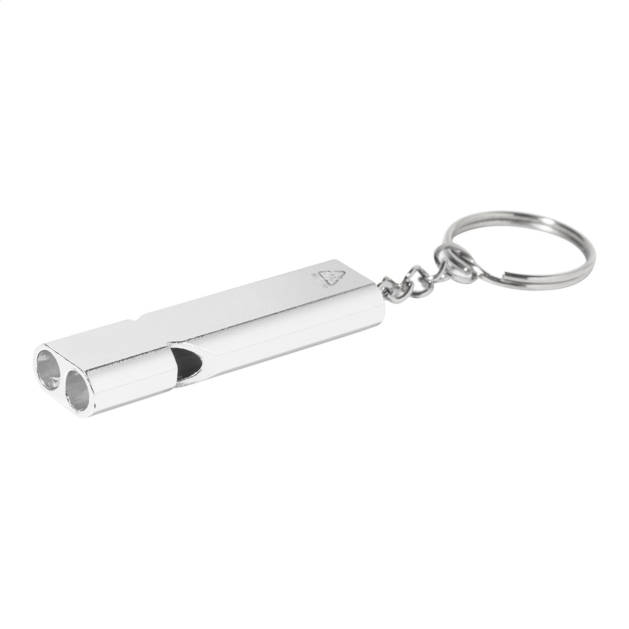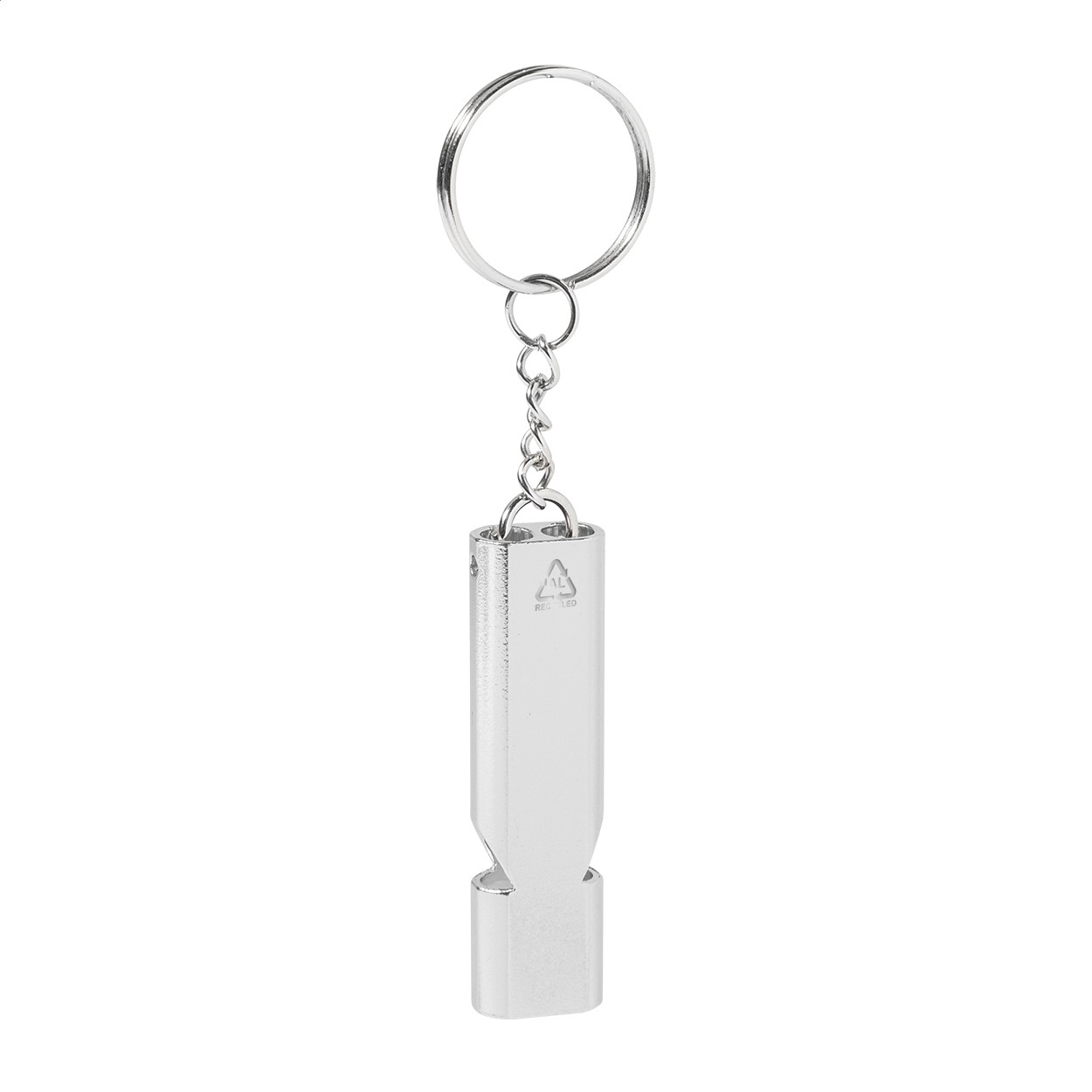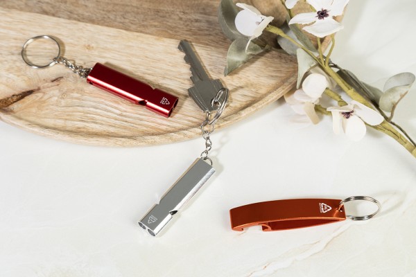 Fluier din aluminiu reciclat, cu breloc metalic.