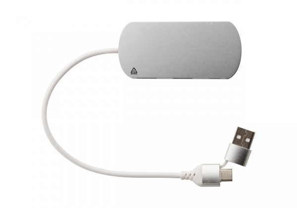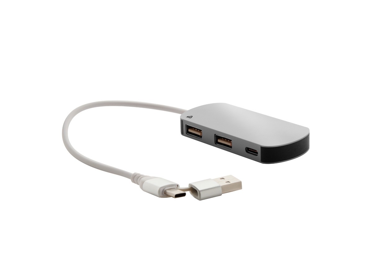 Hub USB din aluminiu reciclat, cu 2 porturi USB și 1 USB-C, USB 2.0. Inclusiv cablu cu conexiuni USB și USB-C.