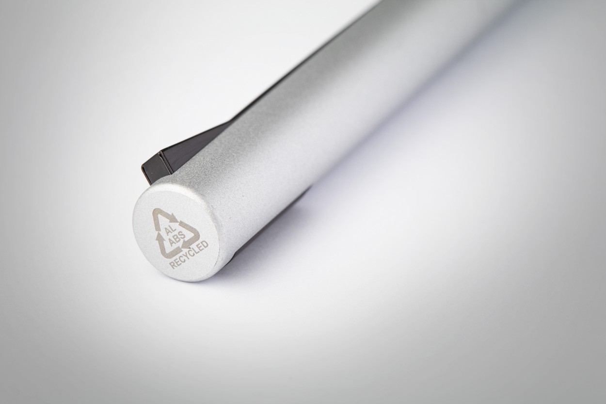 Pix din aluminiu reciclat, de culoare metalizată mată, cu parte superioară din ABS reciclat și clips cu mișcare specială. Cu mină albastră.