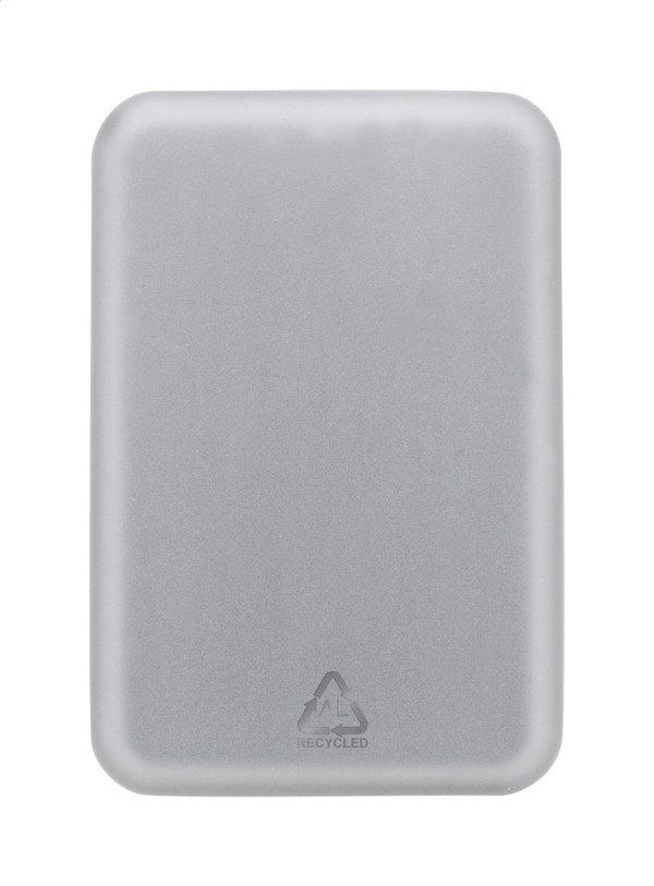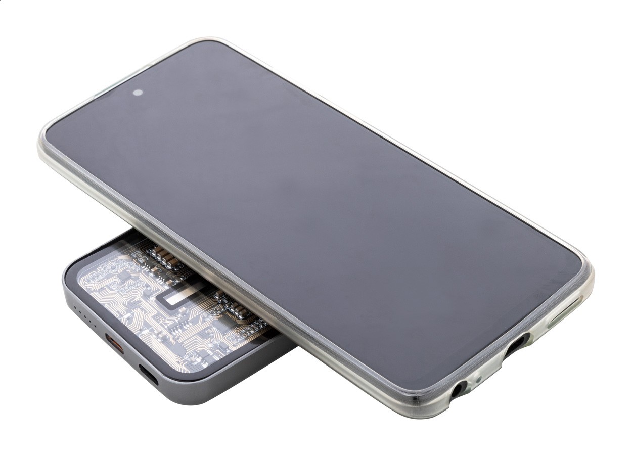 Baterie externă din aluminiu reciclat, cu carcasă semi-transparentă și componente electronice vizibile. Cu baterie de 5000 mAh și încărcător rapid fără fir magnetic încorporat (15 W). Cu intrare USB-C și port pentru încărcător. Include inel metalic autoadeziv pentru a utiliza funcția magnetică pe orice dispozitiv încărcat fără fir. Compatibil cu iPhone® 12 sau mai nou. Inclusiv cablu de încărcare USB.