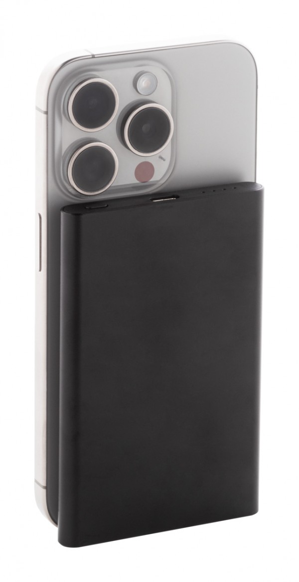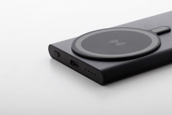 Baterie externă din aluminiu reciclat, cu încărcător rapid wireless magnetic încorporat (15 W) și baterie de 5000 mAh. Cu intrare USB-C și port pentru încărcător. Include inel metalic autoadeziv pentru a utiliza funcția magnetică pe orice dispozitiv wirless. Compatibil cu iPhone® 12 sau mai nou. Inclusiv cablu de încărcare USB.
