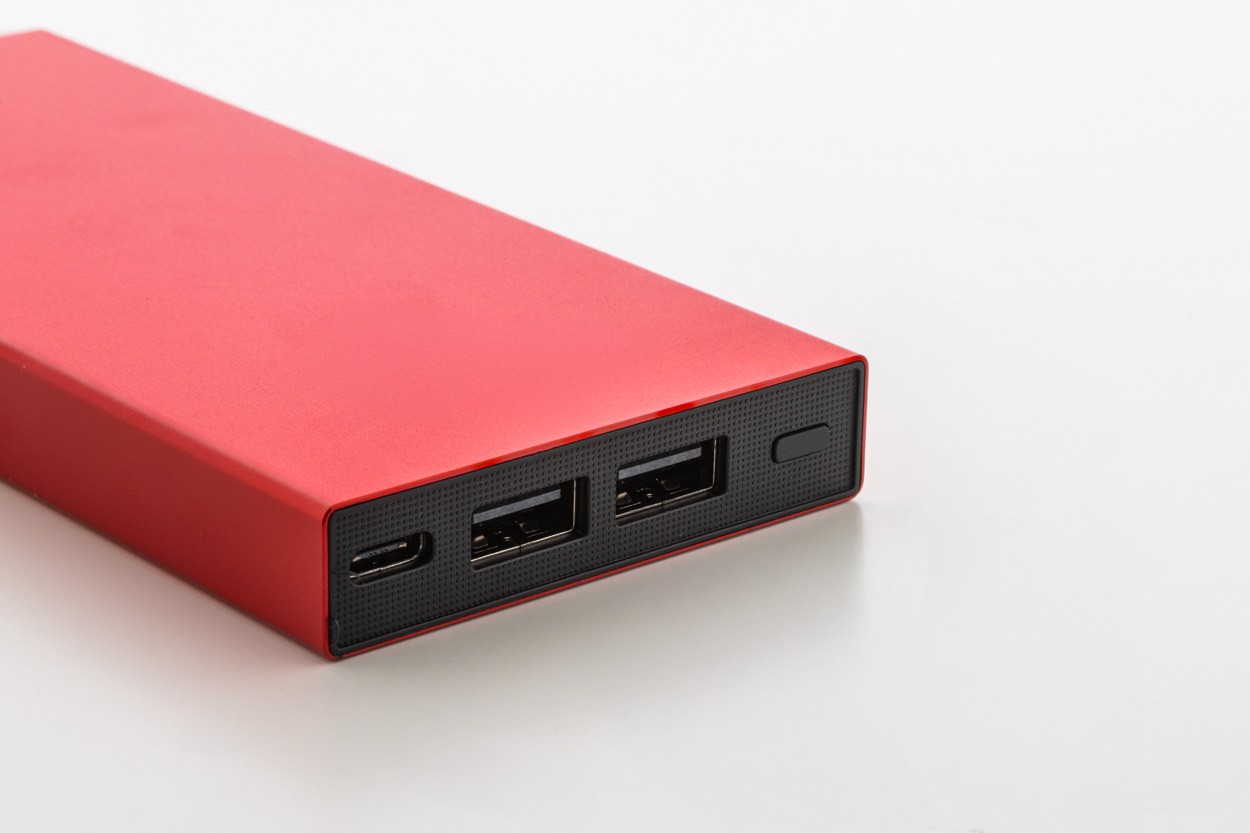 Baterie externă din aluminiu reciclat, cu baterie de 10000 mAh. Cu 2 porturi USB și 1 USB-C pentru încărcător. Port de intrare USB-C. Inclusiv cablu de încărcare USB.