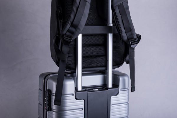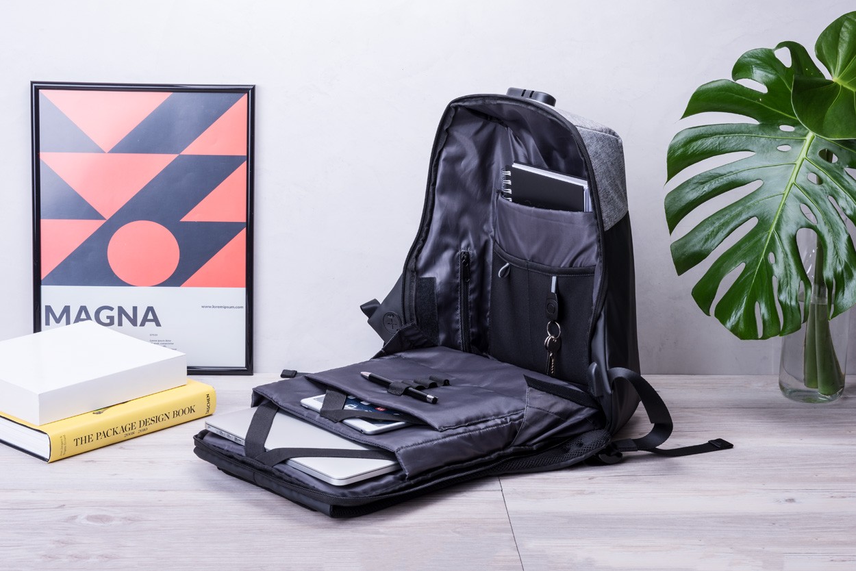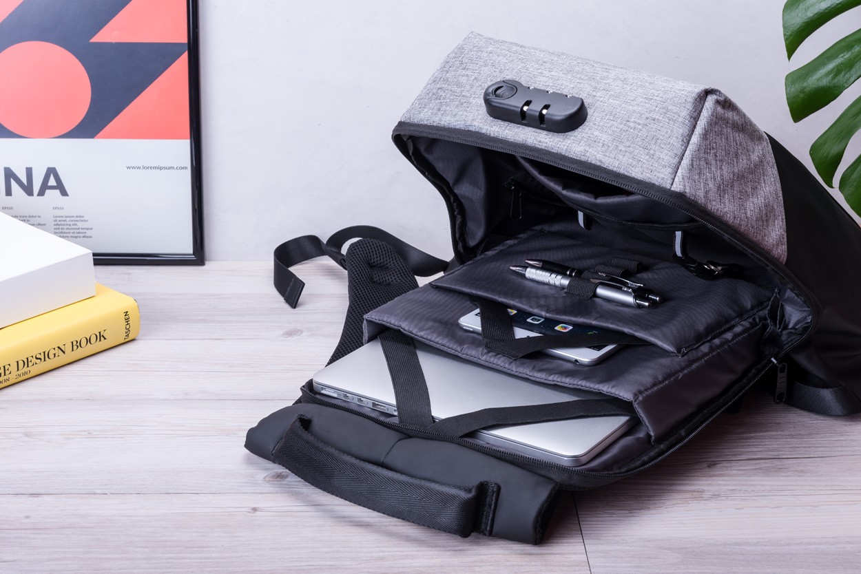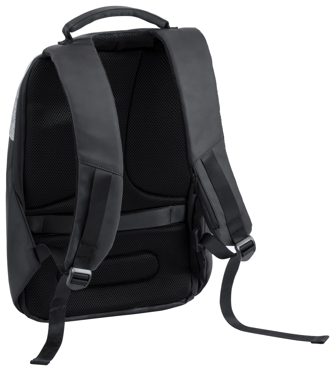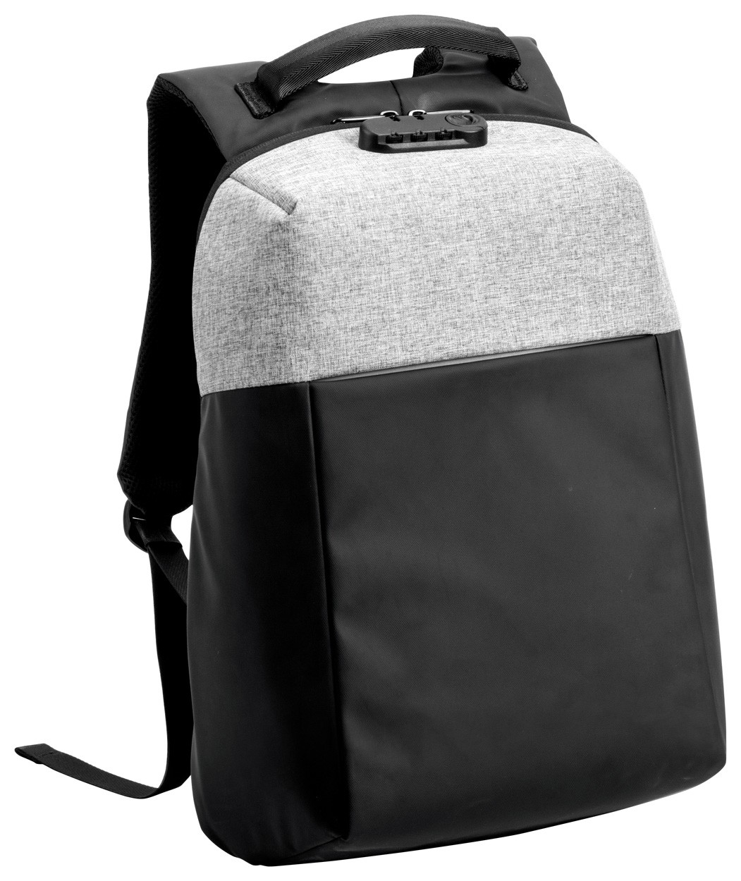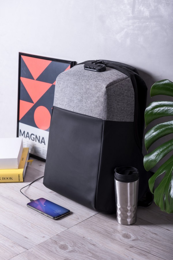 Rucsac rezistent la apă, cu mai multe compartimente cu fermoar, compartiment pentru laptop și compartiment pentru tabletă, spate și bretele căptușite, conexiune USB încorporată pentru power bank. Lacăt de siguranță cu 3 cifre. Poliester 900D.