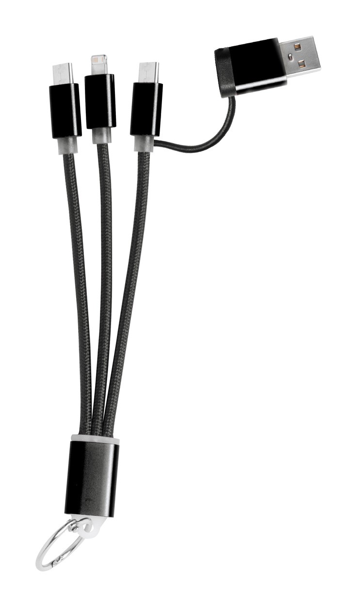 Cablu de încărcare USB din aluminiu cu breloc. Cu conectori micro USB, USB-C și Lightning. Cu intrări USB și USB-C.