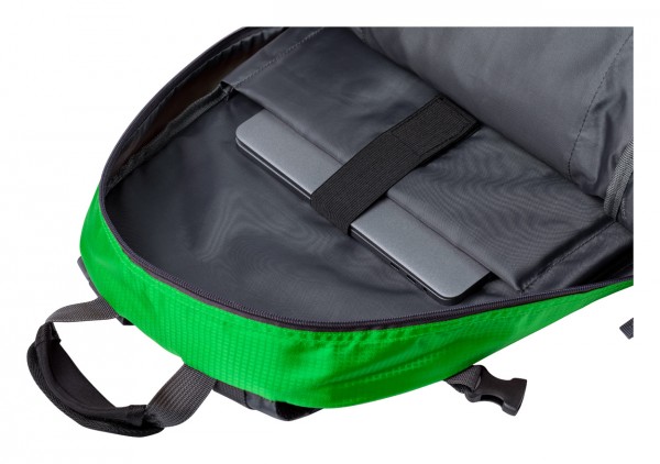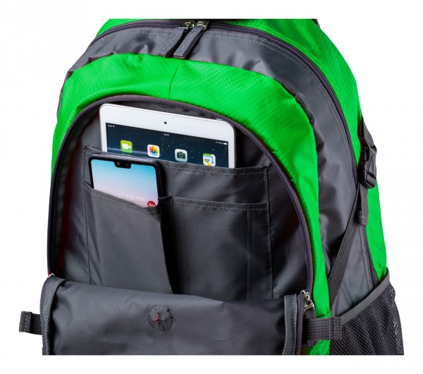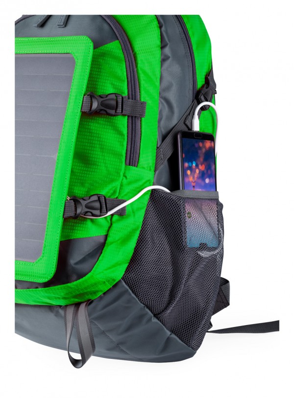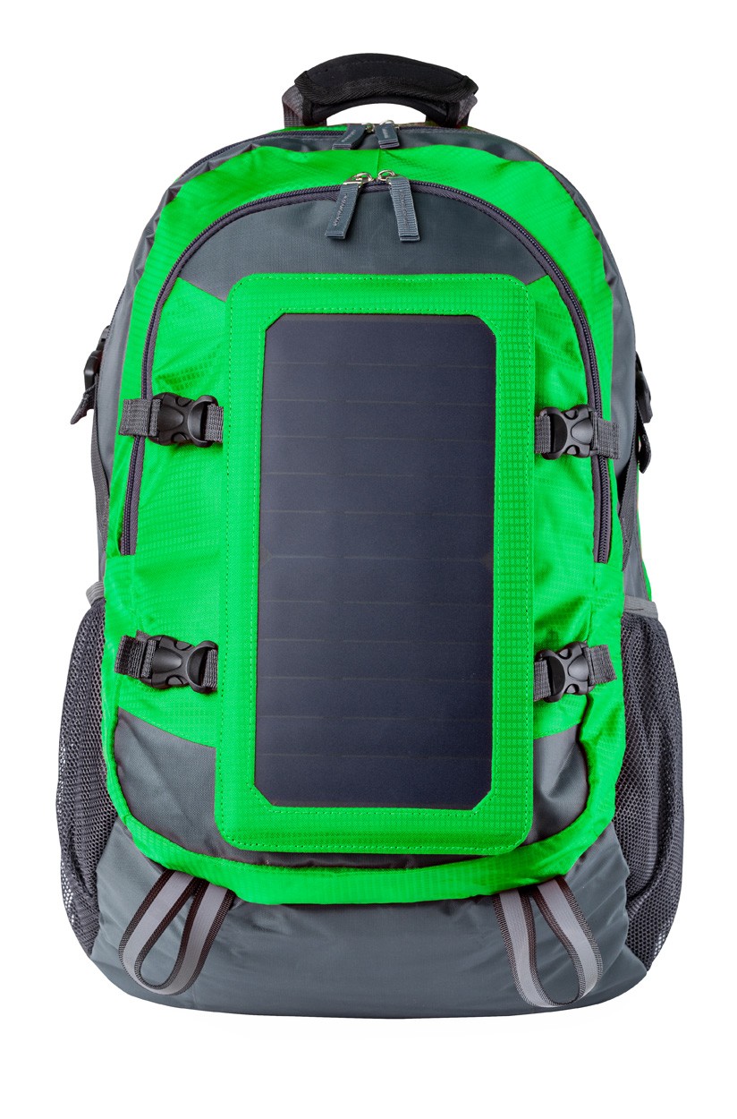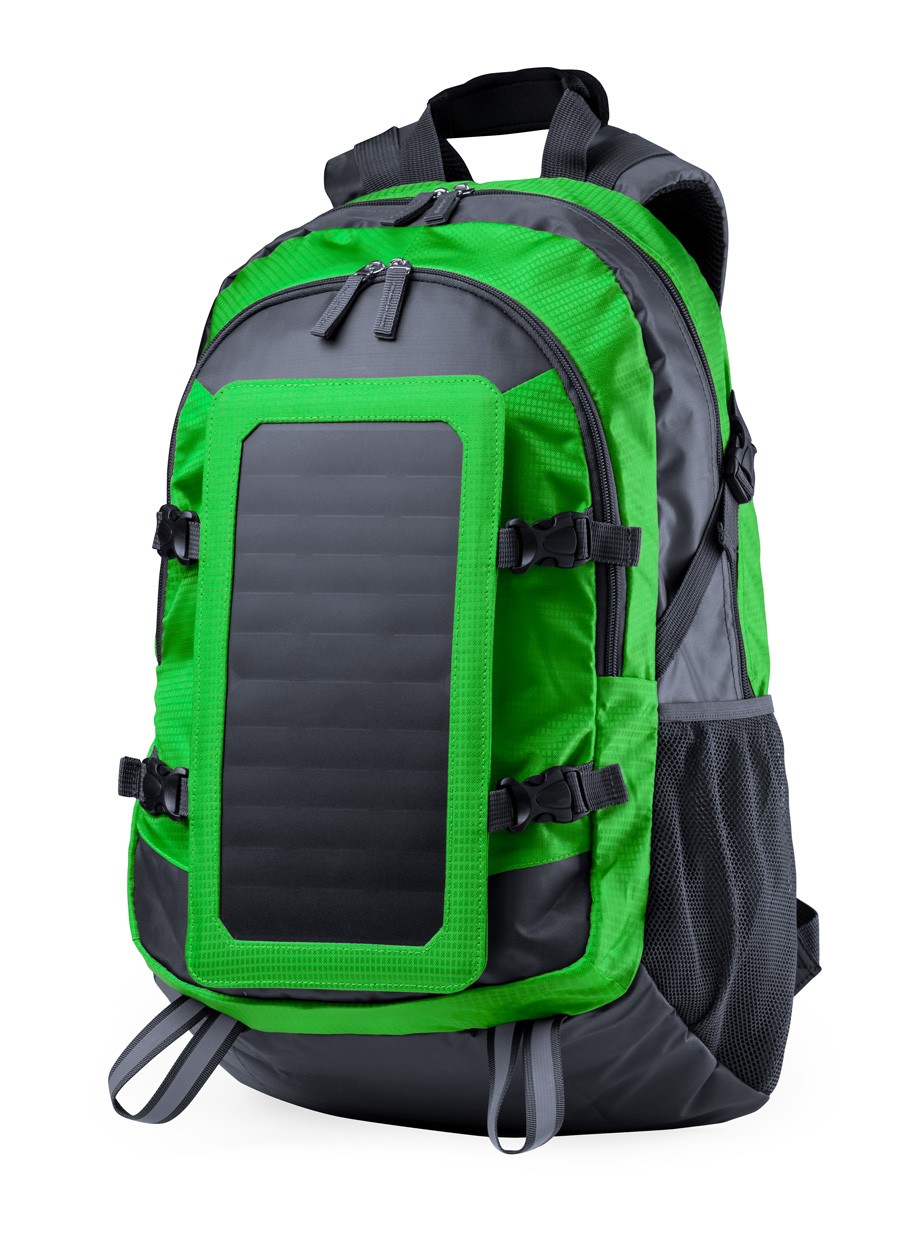 Rucsac din material rezistent la apă, cu panou solar detașabil, cu port încărcător USB. Mai multe compartimente cu fermoar. Compartiment căptușit pentru laptop, cu spate și bretele întărite.