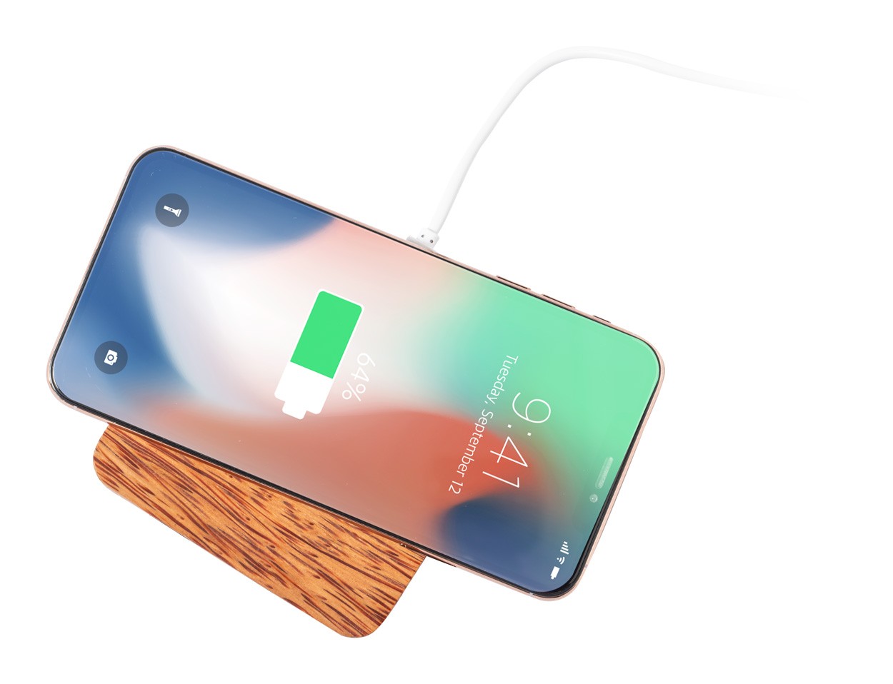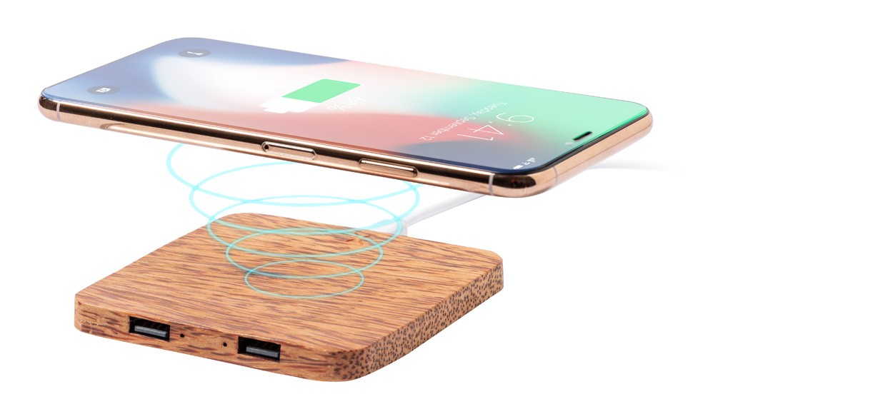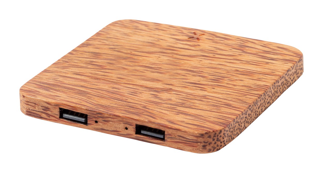 Încărcător rapid fără fir (10W), în carcasă de nucă de cocos, cu 2 porturi de încărcare USB. Max. ieșire: 2100 mA. Inclusiv cablu de încărcare USB.