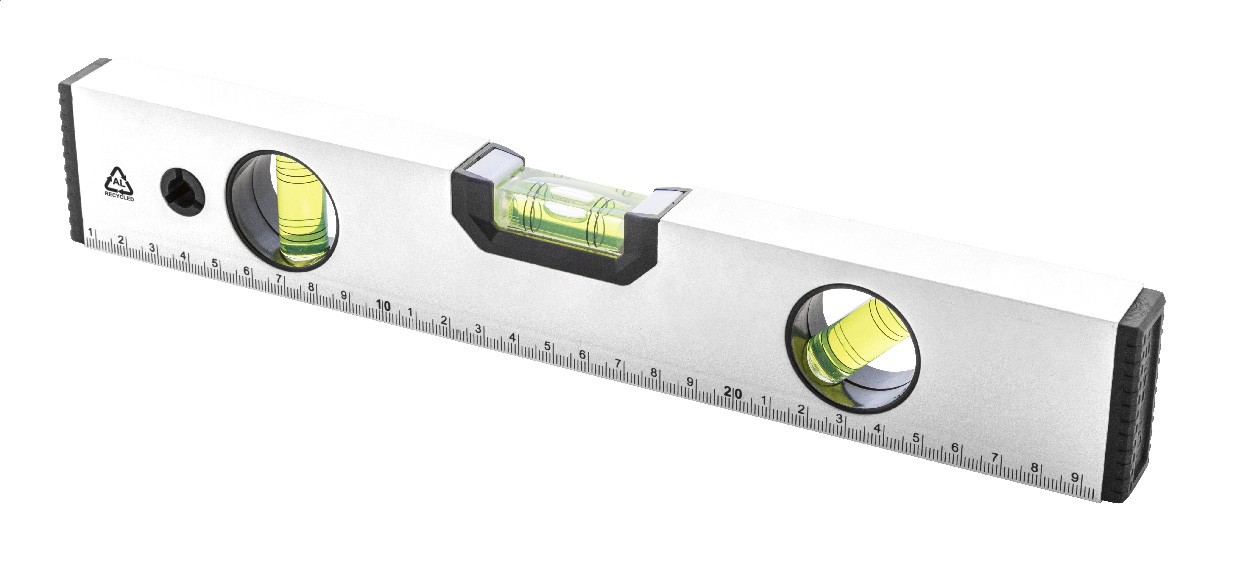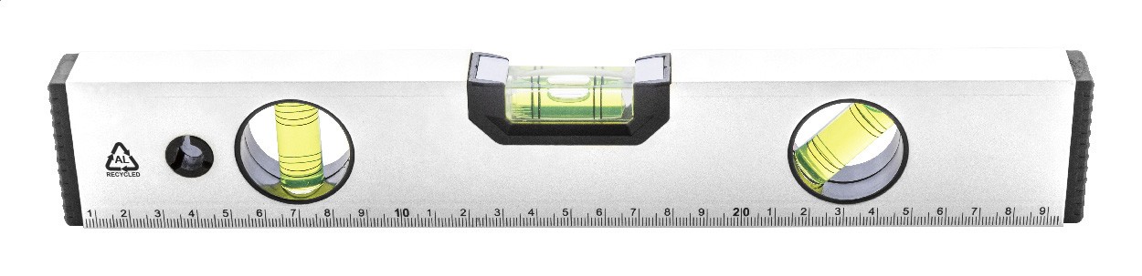 Boloboc din aluminiu reciclat, cu nivele triple (orizontală, verticală și la 45°) și riglă de 30 cm.