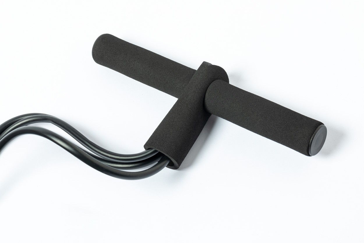 Bandă de exerciții de rezistență medie, din cauciuc TPE, cu mânere căptușite și suporturi pentru picioare din plastic EVA și ABS. În husă din poliester RPET.