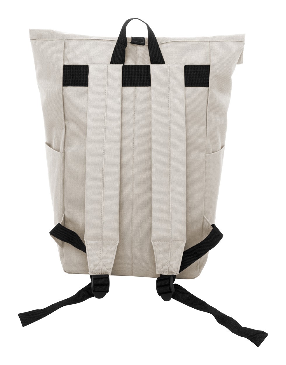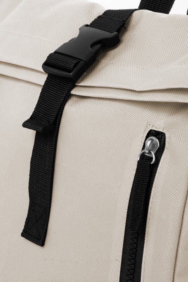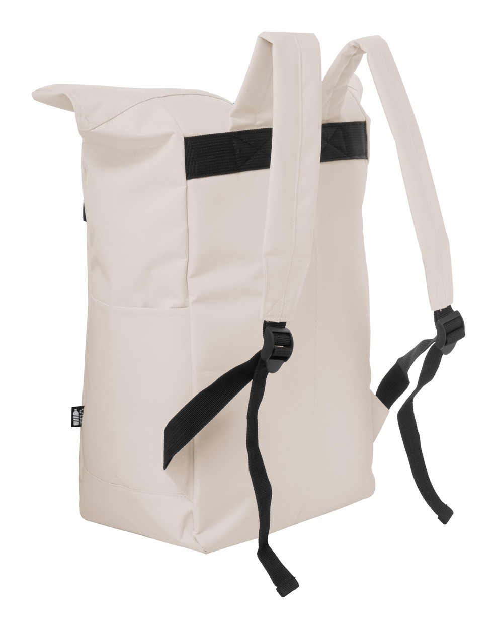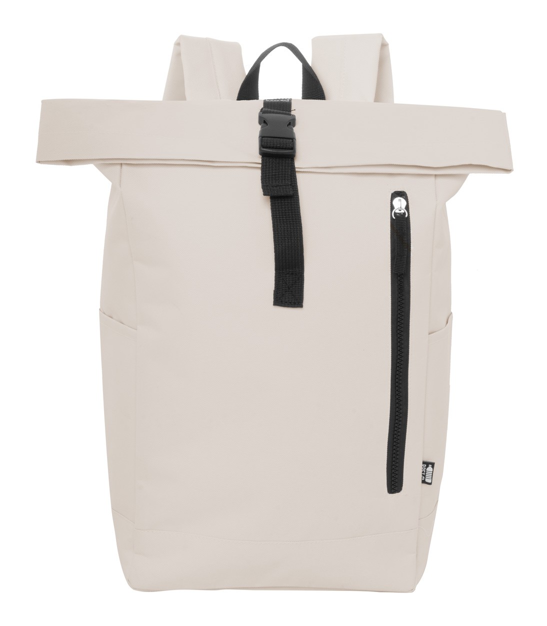 Rucsac RPET, cu închidere cu cataramă, compartiment pentru laptop (14") și buzunar frontal cu fermoar. Cu spate și bretele căptușite. Poliester 600D RPET cu etichetă distinctivă RPET.