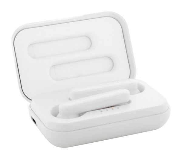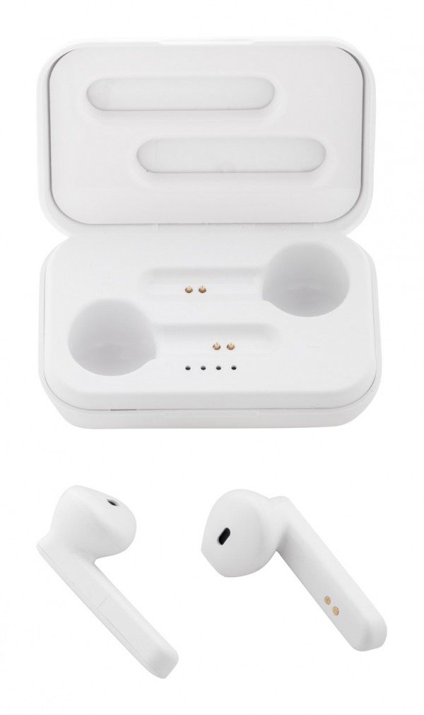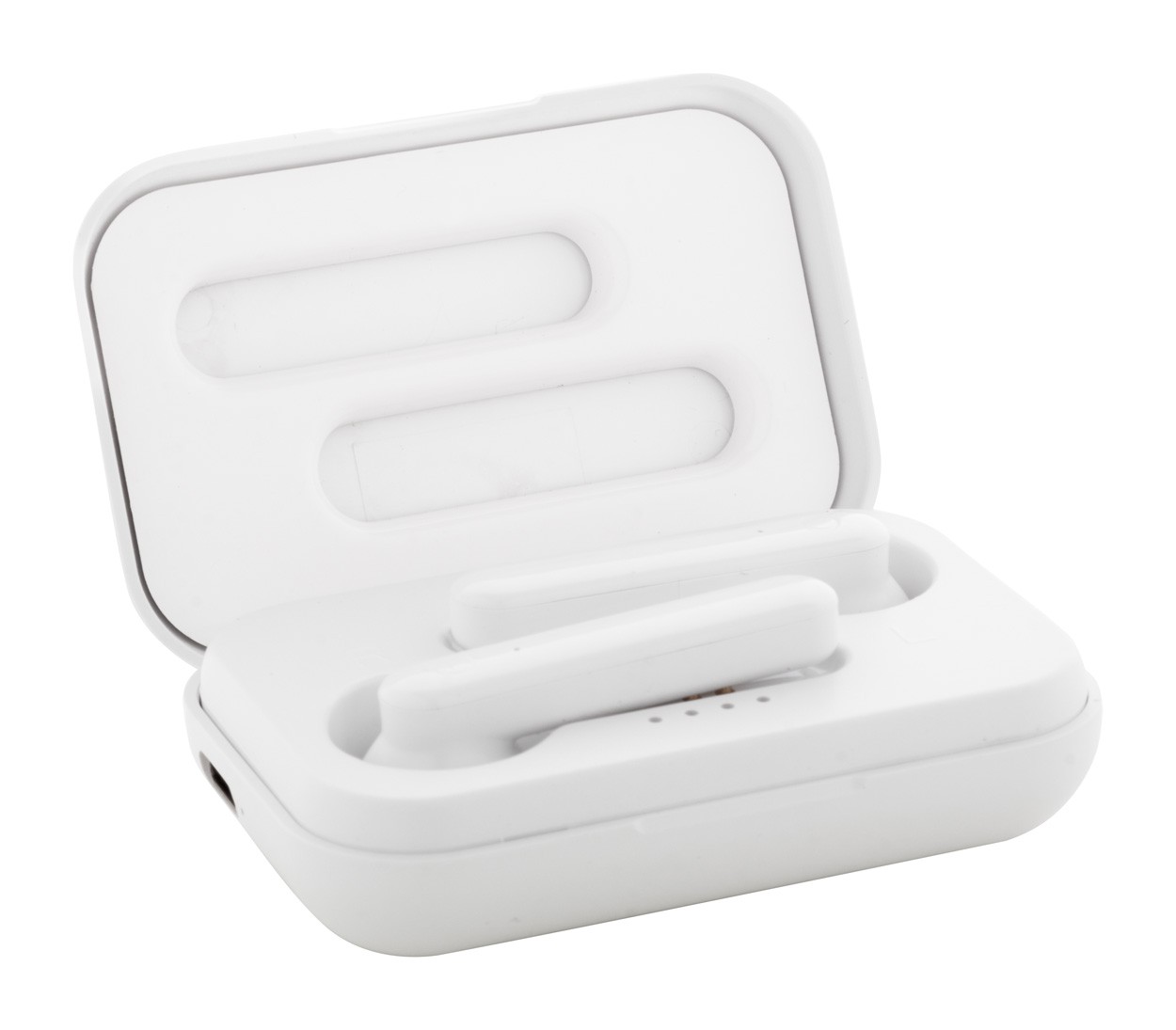 Căști adevărate stereo fără fir (TWS) din plastic ABS reciclat cu funcție de apelare mâini libere, în carcasă de plastic pentru încărcător cu baterie de 400 mAh. Inclusiv cablu de încărcare USB.