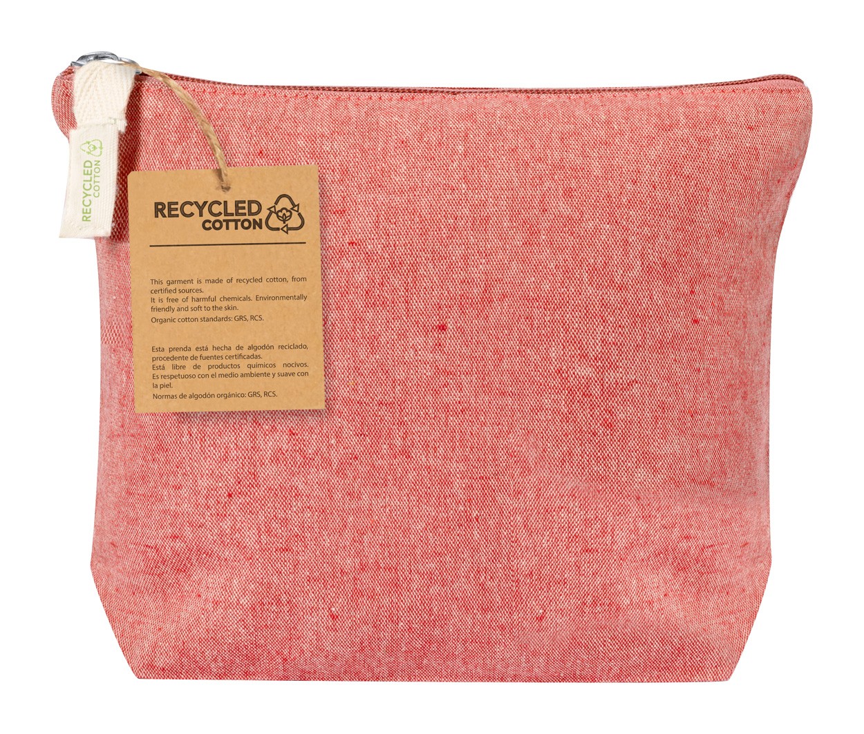 Geantă cosmetică, cu fermoar, din bumbac reciclat. Cu etichetă distinctivă din bumbac reciclat.