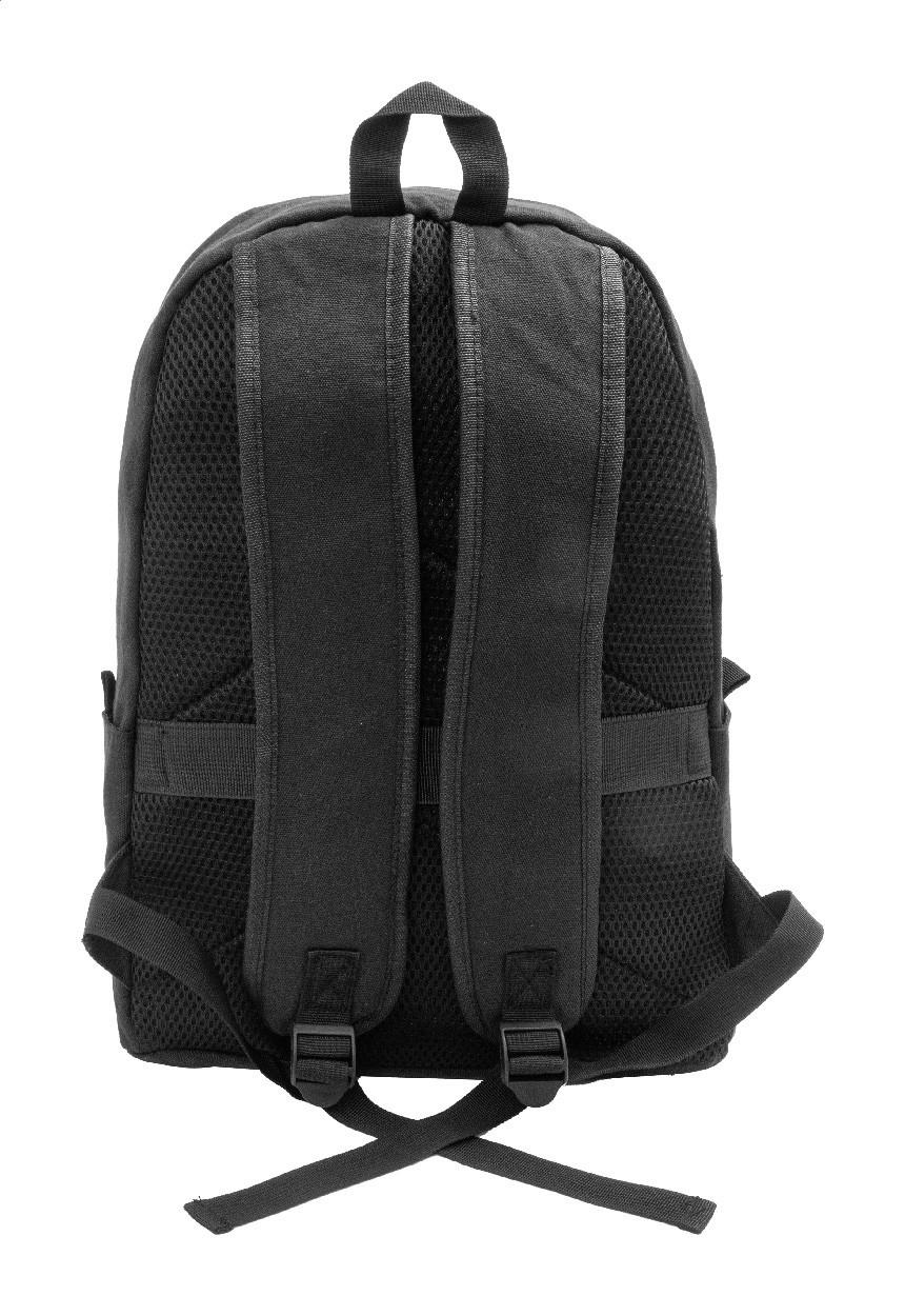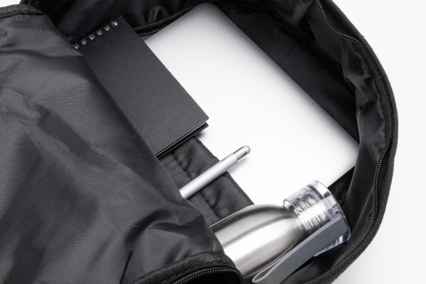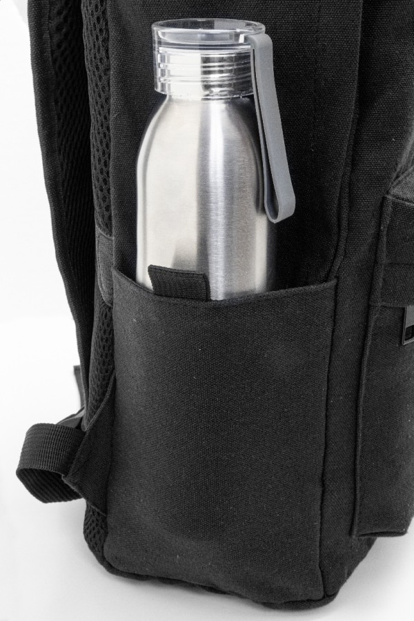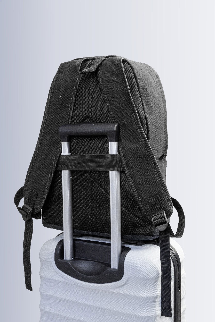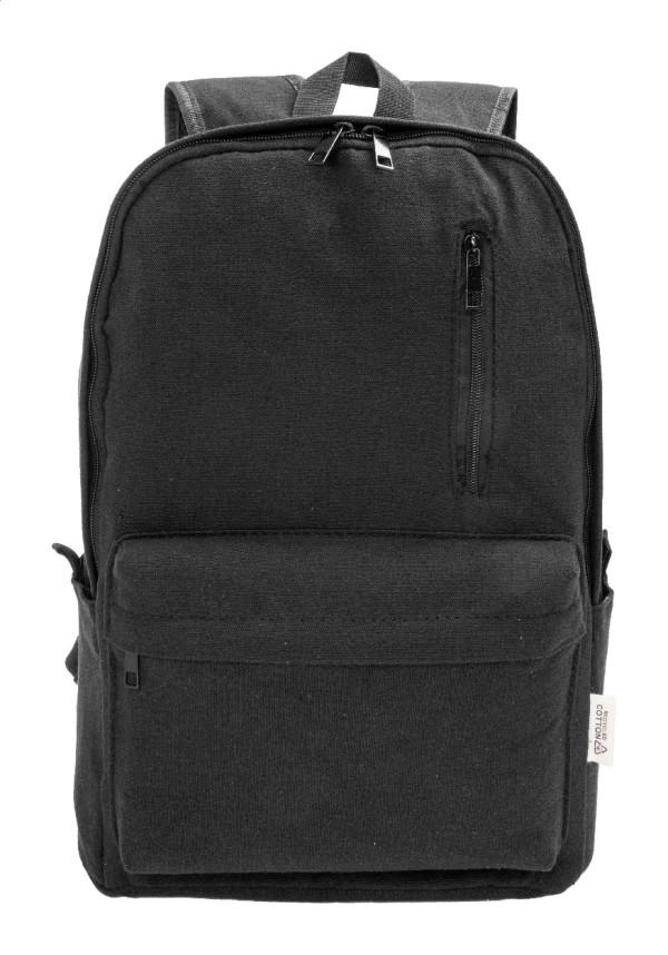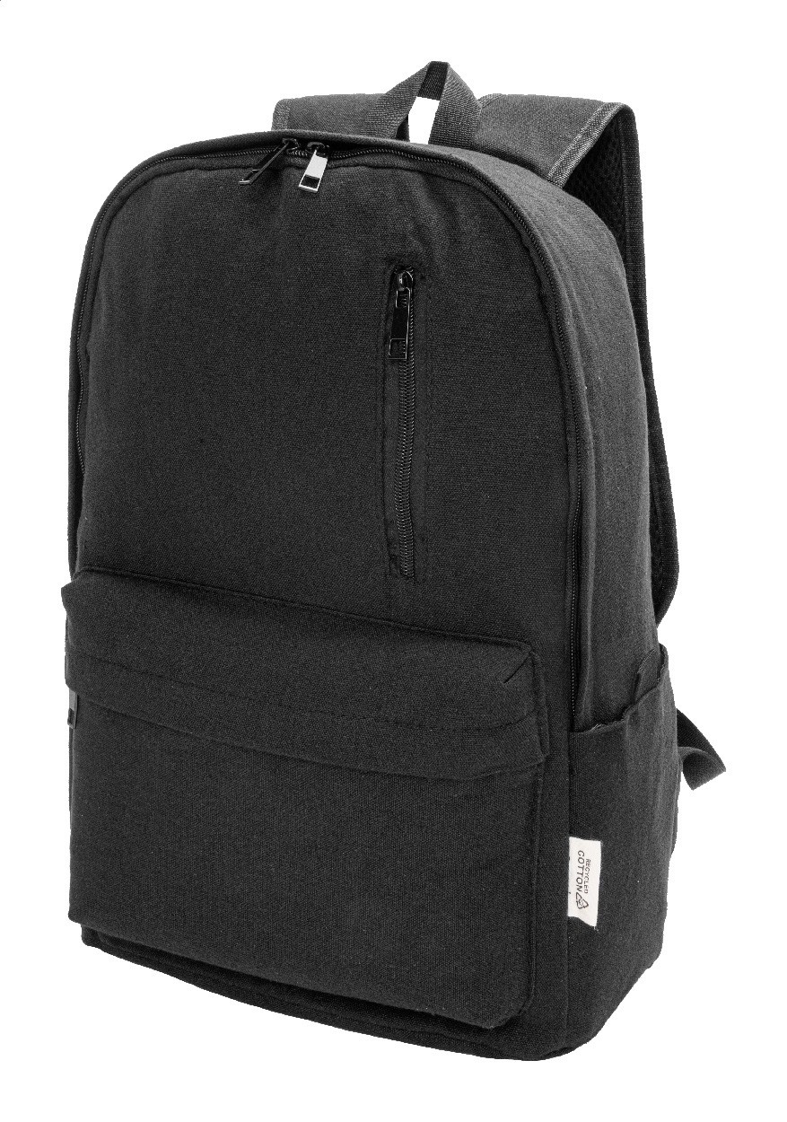 Rucsac din pânză reciclată, cu compartiment principal cu fermoar, compartiment căptușit pentru laptop (15"), 2 buzunare frontale cu fermoar, buzunare laterale, curea pentru troler, bretele căptușite pentru spate și umăr. 70% bumbac reciclat și 30% poliester RPET. Cu etichetă distinctivă din bumbac reciclat.