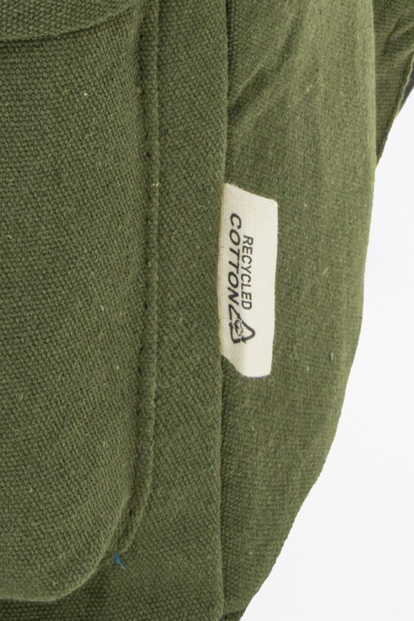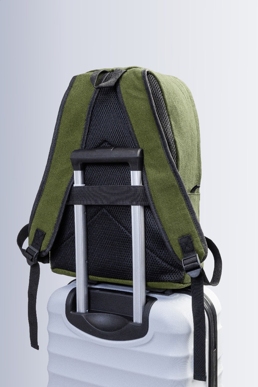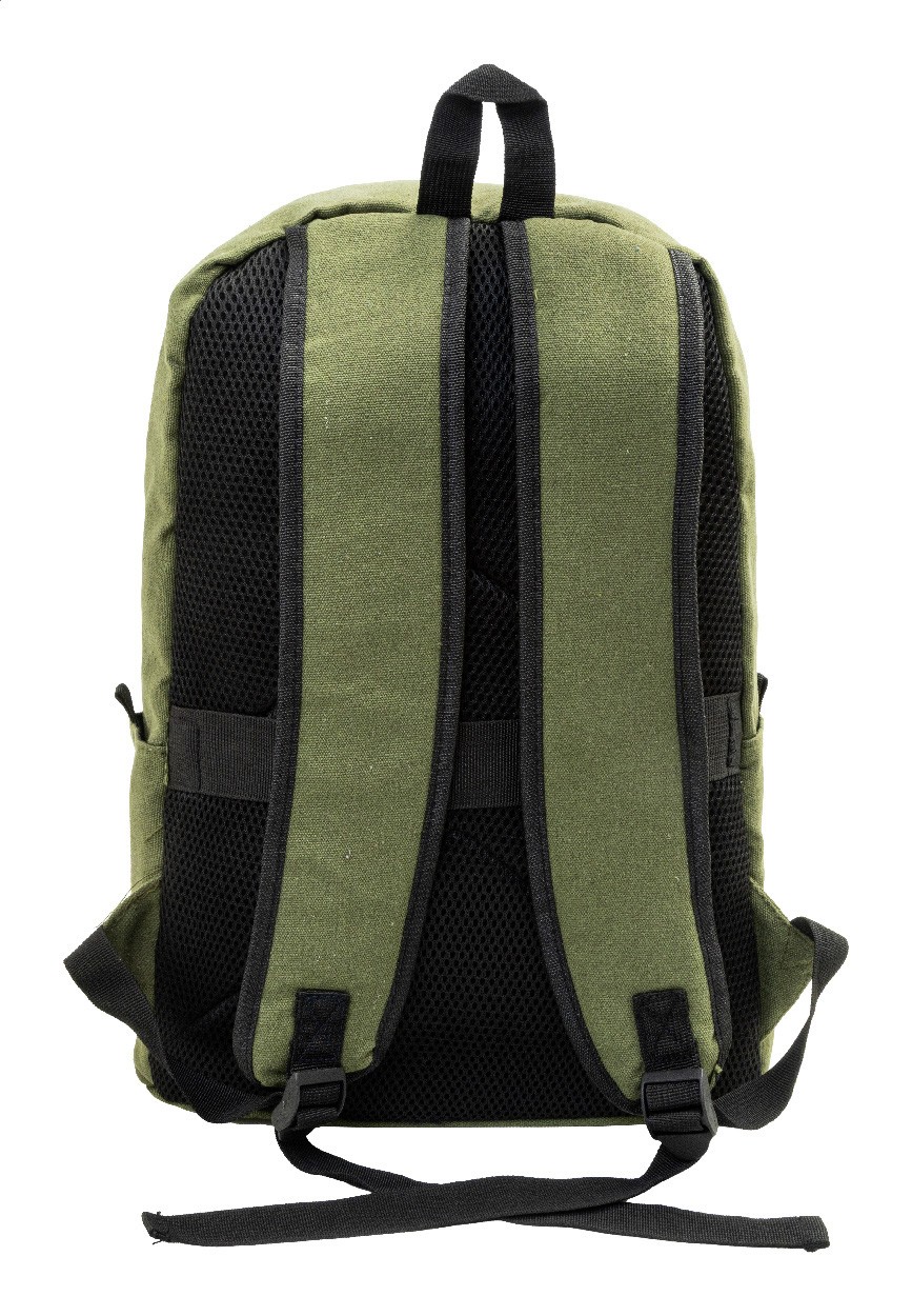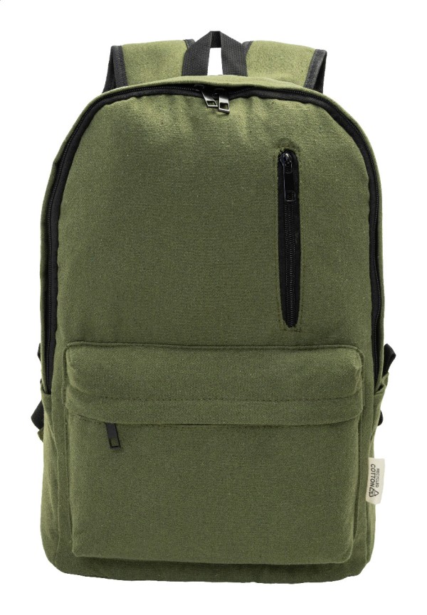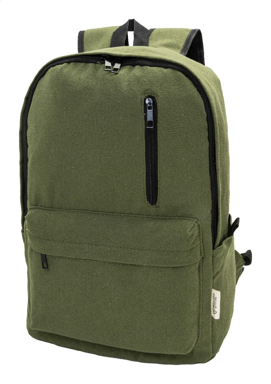 Rucsac din pânză reciclată, cu compartiment principal cu fermoar, compartiment căptușit pentru laptop (15"), 2 buzunare frontale cu fermoar, buzunare laterale, curea pentru troler, bretele căptușite pentru spate și umăr. 70% bumbac reciclat și 30% poliester RPET. Cu etichetă distinctivă din bumbac reciclat.