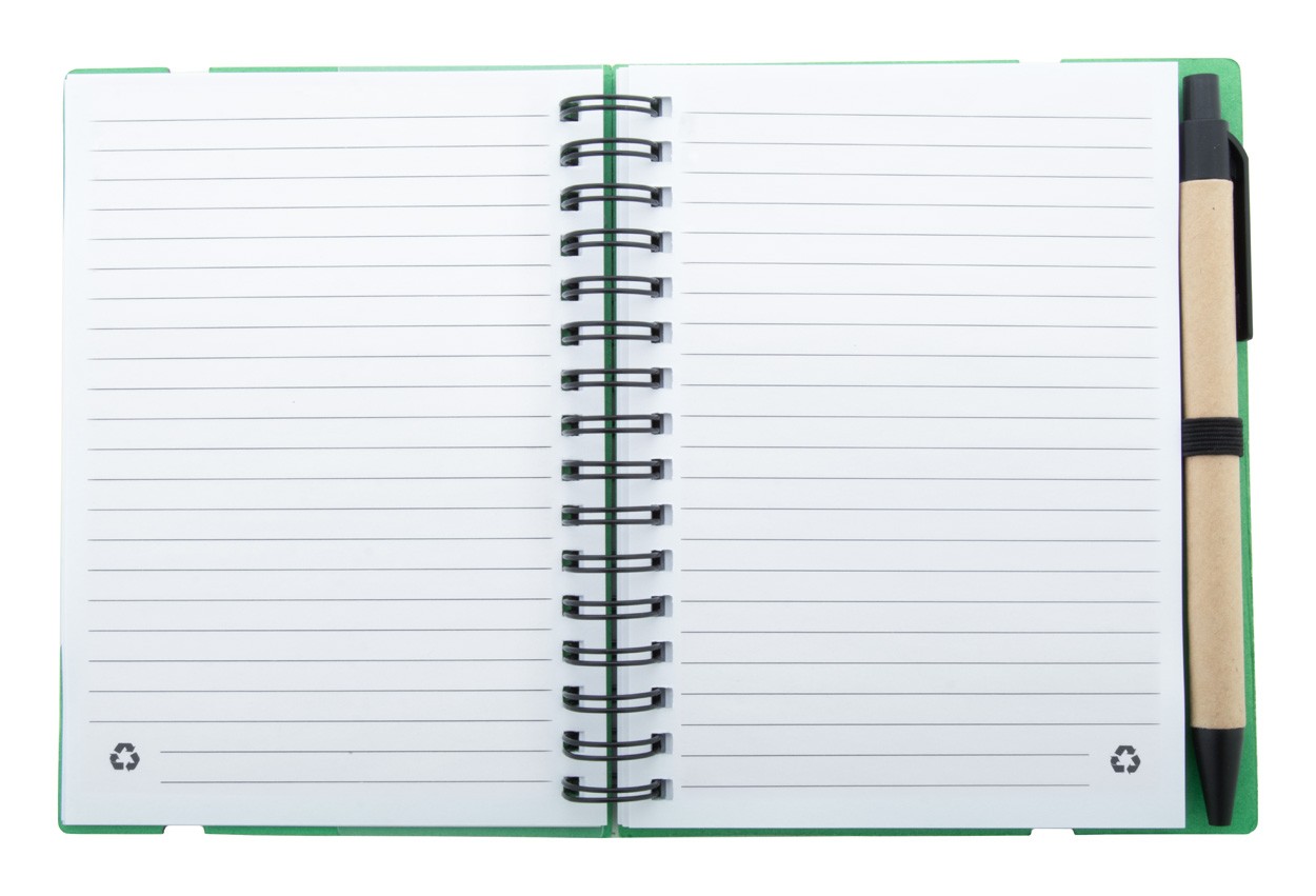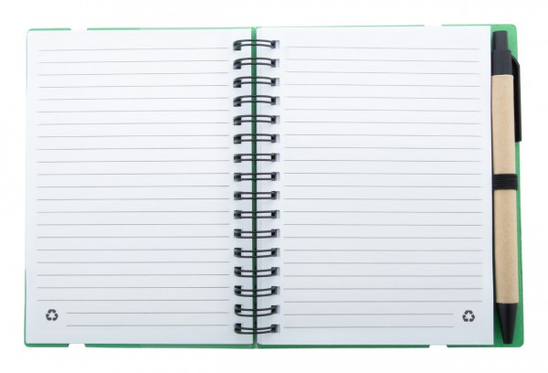 Caiet spiralat, din hârtie reciclată, cu 70 de foi dictando și 125 de markere de pagini (în 5 culori diferite). Cu curea de cauciuc și suport pentru pix. Dimensiune A6. Inclusiv pix din hârtie reciclată cu mină albastră.