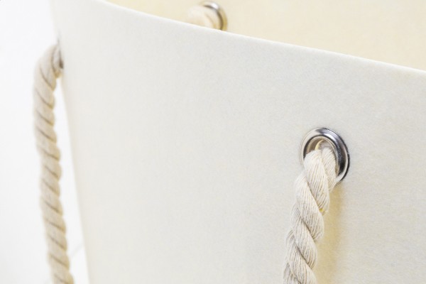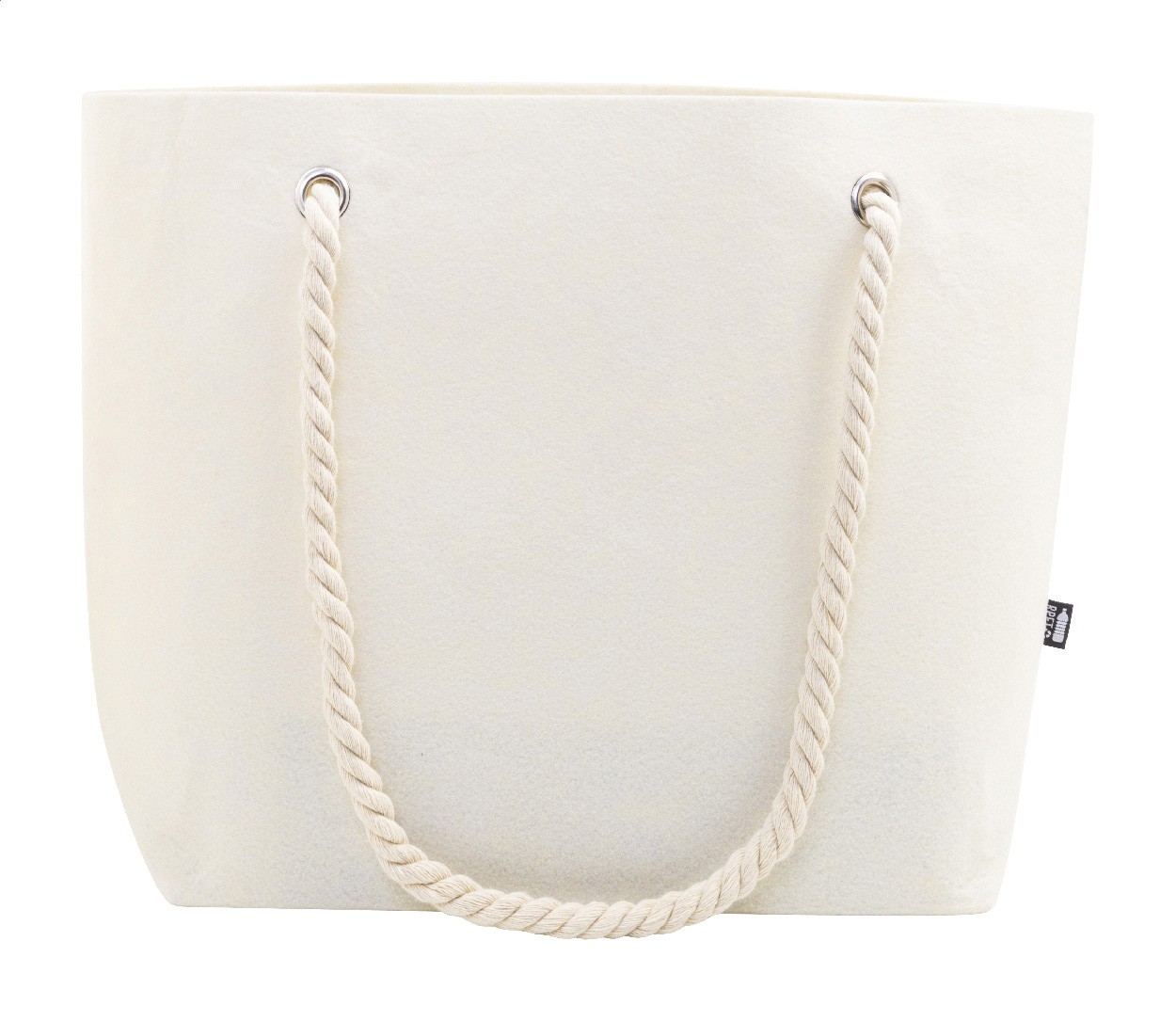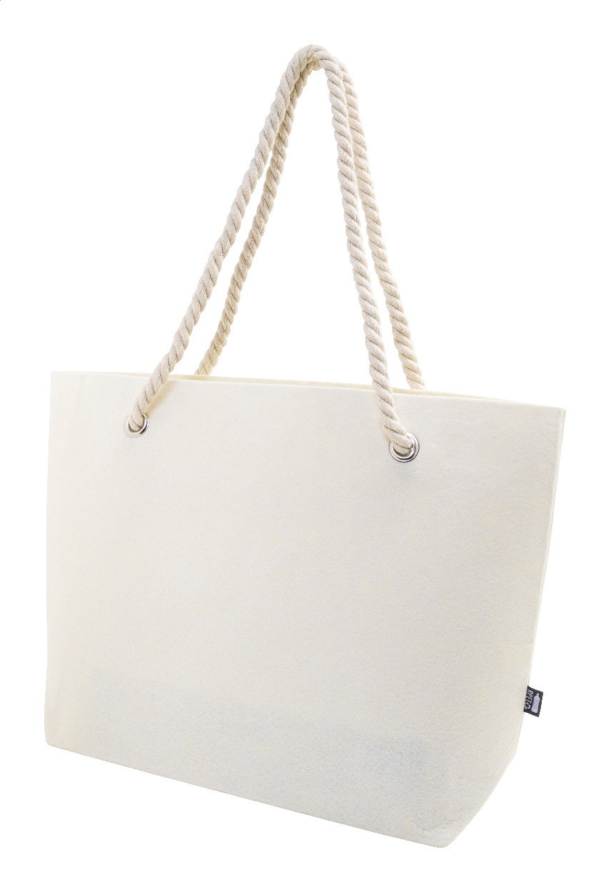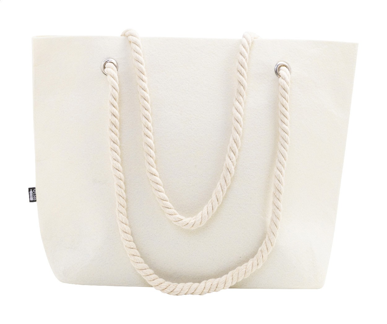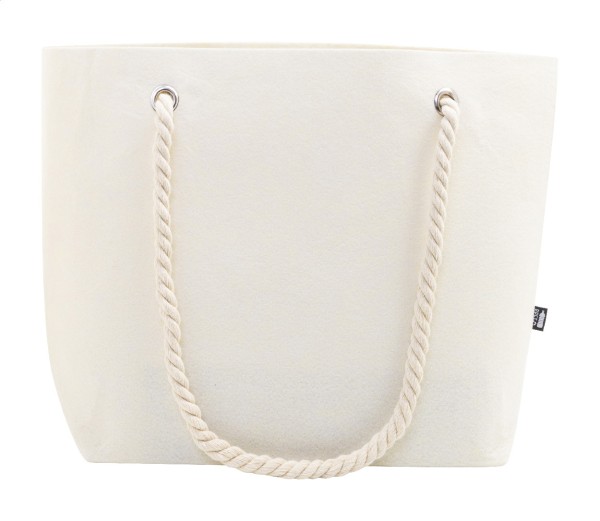 Geantă de plajă sau de cumpărături, din fetru RPET, cu mânere din șnur de bumbac și clin la bază. Cu etichetă distinctivă din RPET.