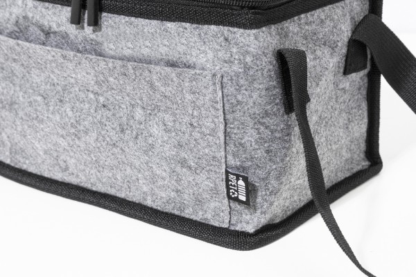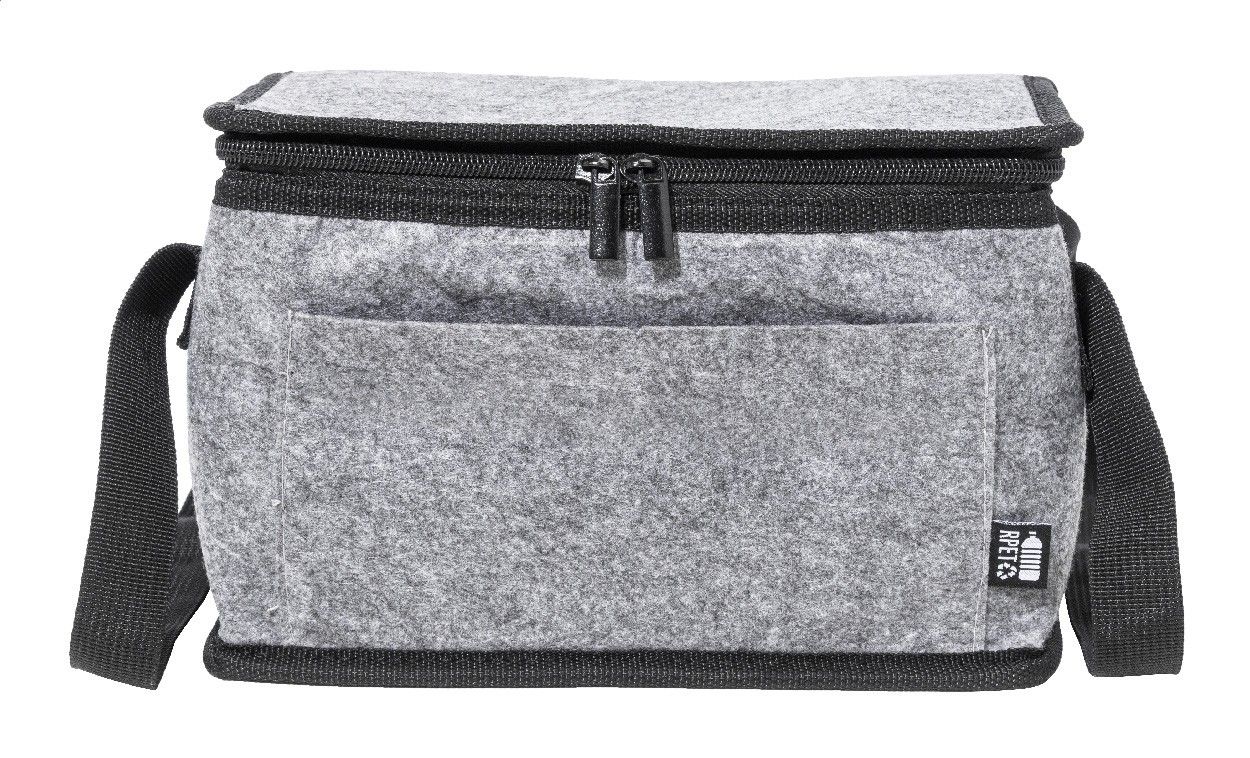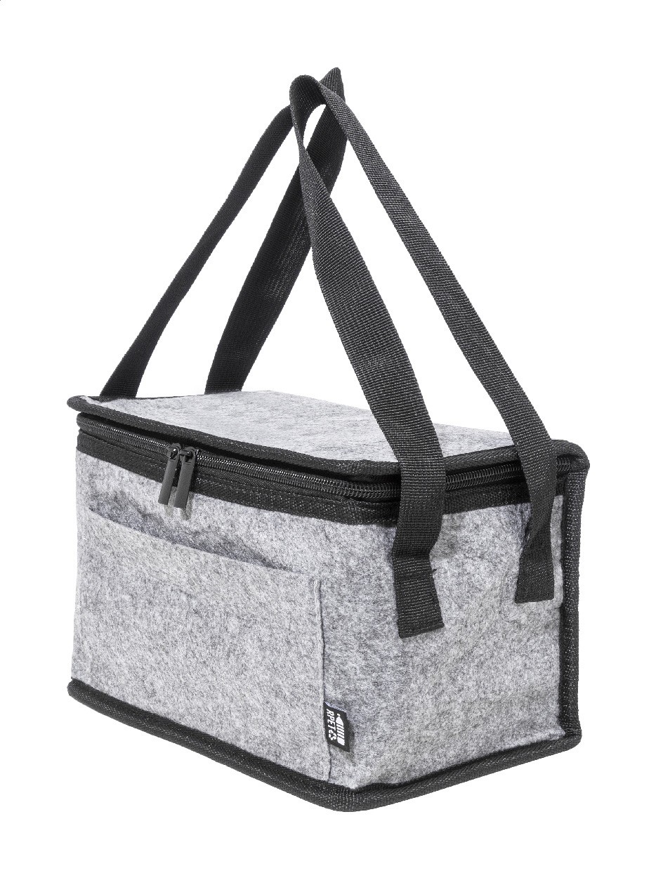 Geantă frigorifică cu fermoar, din fetru RPET, cu căptușeală din aluminiu, buzunar frontal și mânere laterale. Cu etichetă distinctivă RPET.