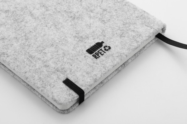 Agendă cu copertă din fetru RPET, cu 80 de foi dictando din hârtie reciclată. Cu semn de carte, curea de cauciuc și suport pentru pix. Dimensiune A5.