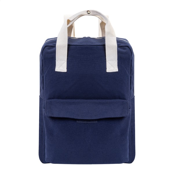 Rucsac din pânză reciclată, cu compartiment principal cu fermoar, compartiment căptușit pentru laptop (13") și buzunar frontal cu închidere cu velcro. 70% bumbac reciclat și 30% poliester RPET. Cu etichetă distinctivă din bumbac reciclat.