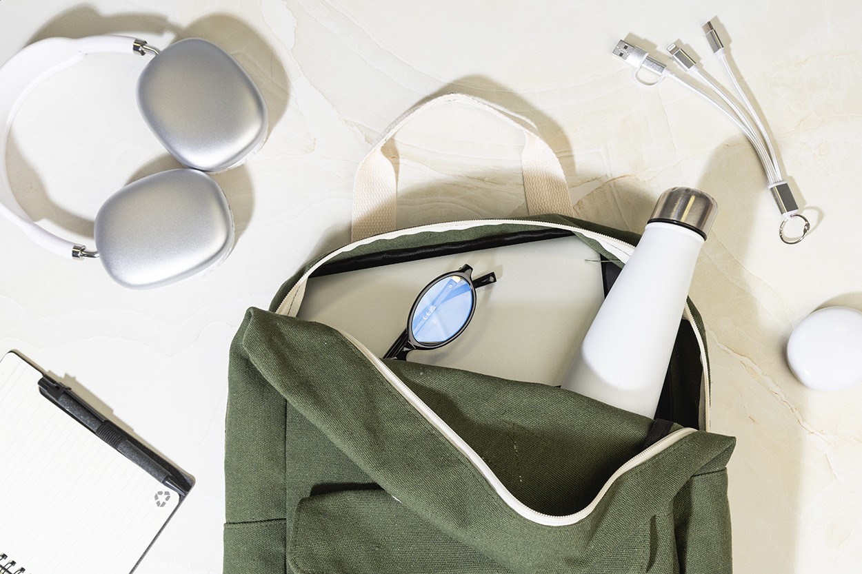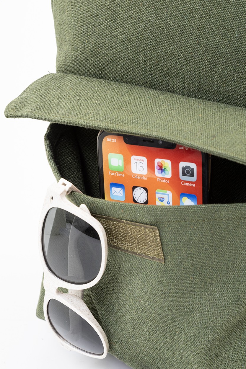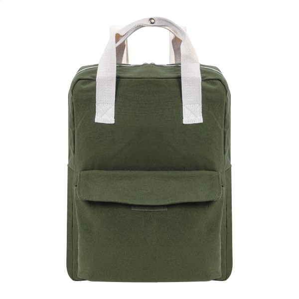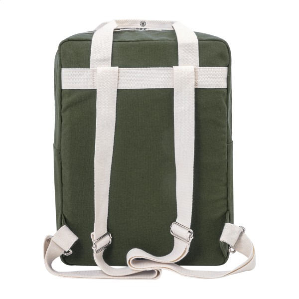 Rucsac din pânză reciclată, cu compartiment principal cu fermoar, compartiment căptușit pentru laptop (13") și buzunar frontal cu închidere cu velcro. 70% bumbac reciclat și 30% poliester RPET. Cu etichetă distinctivă din bumbac reciclat.