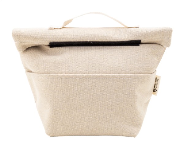 Geantă frigorifică, roll-top, din pânză reciclată, cu buzunar frontal, căptușeală din aluminiu și închidere cu velcro. 70% bumbac reciclat și 30% poliester RPET. Cu etichetă distinctivă din bumbac reciclat.