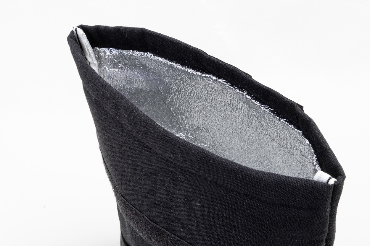 Geantă frigorifică, roll-top, din pânză reciclată, cu buzunar frontal, căptușeală din aluminiu și închidere cu velcro. 70% bumbac reciclat și 30% poliester RPET. Cu etichetă distinctivă din bumbac reciclat.
